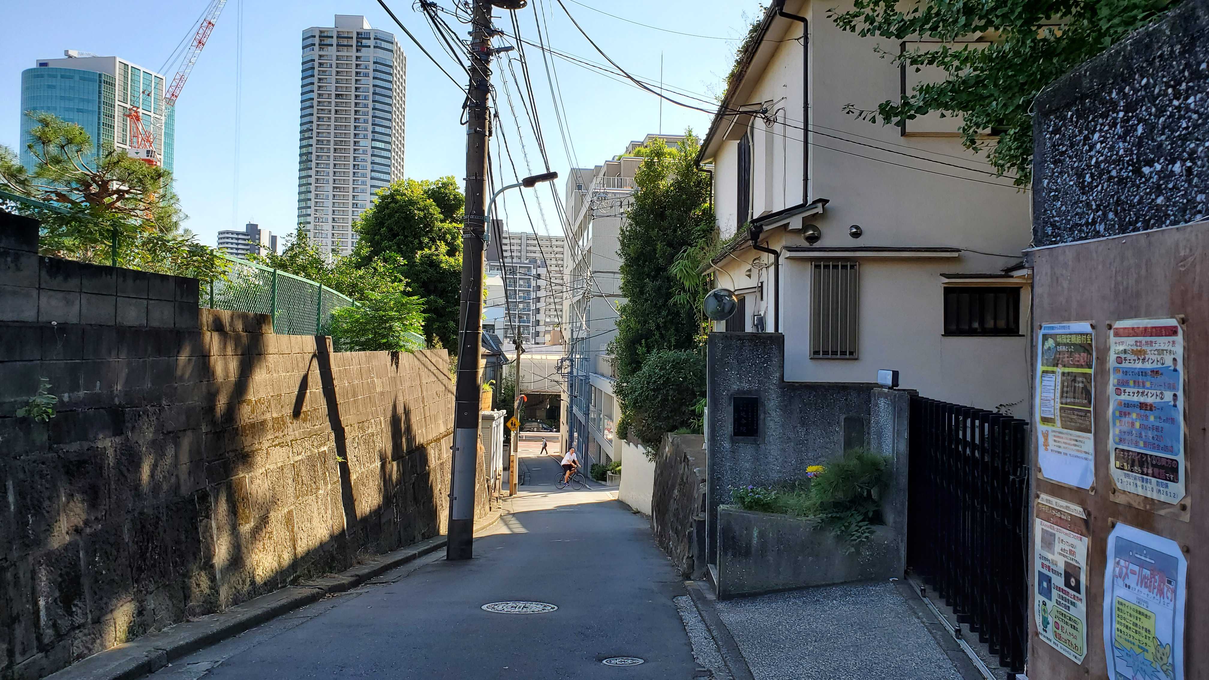 延命院前から見た絶江坂……45階建ての白金高輪駅にそびえるマンション。数年後には手前にも高いのが建ちます。