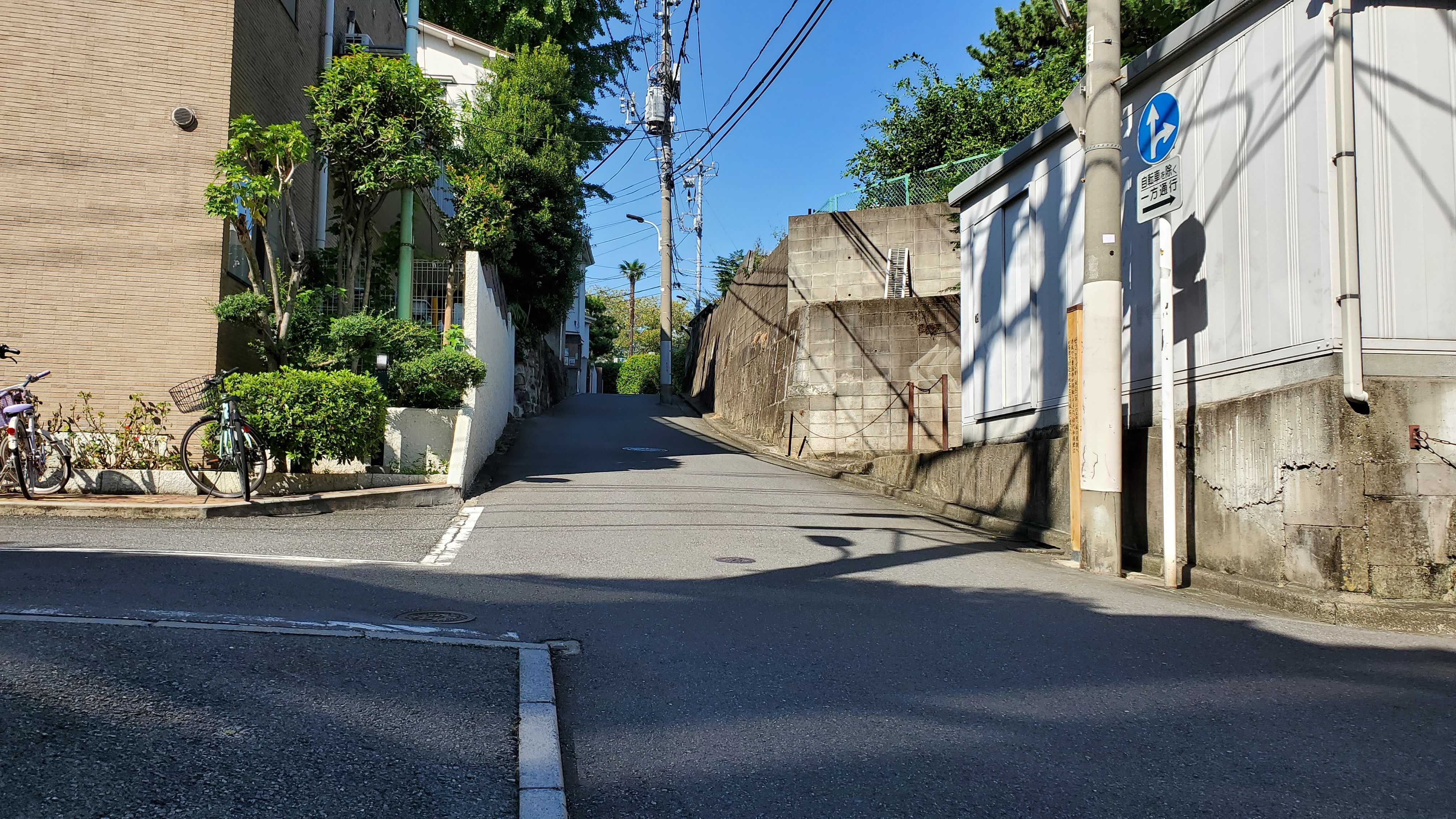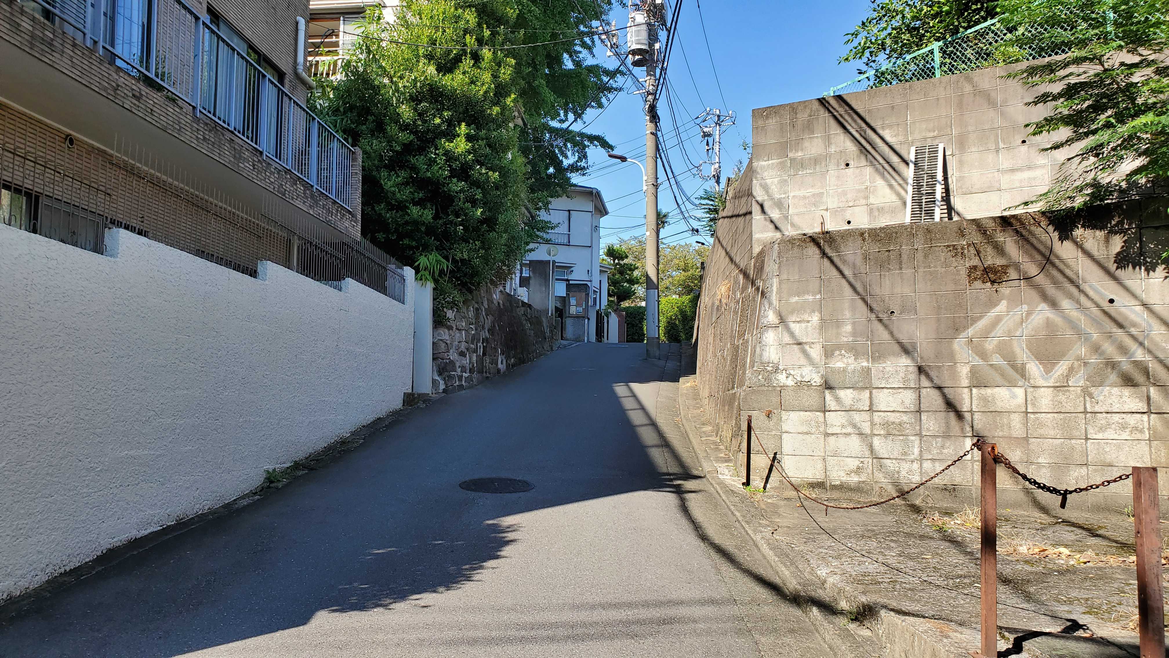 写真の右から来た私ですが、北に向かって坂……右の電信柱の後ろに…