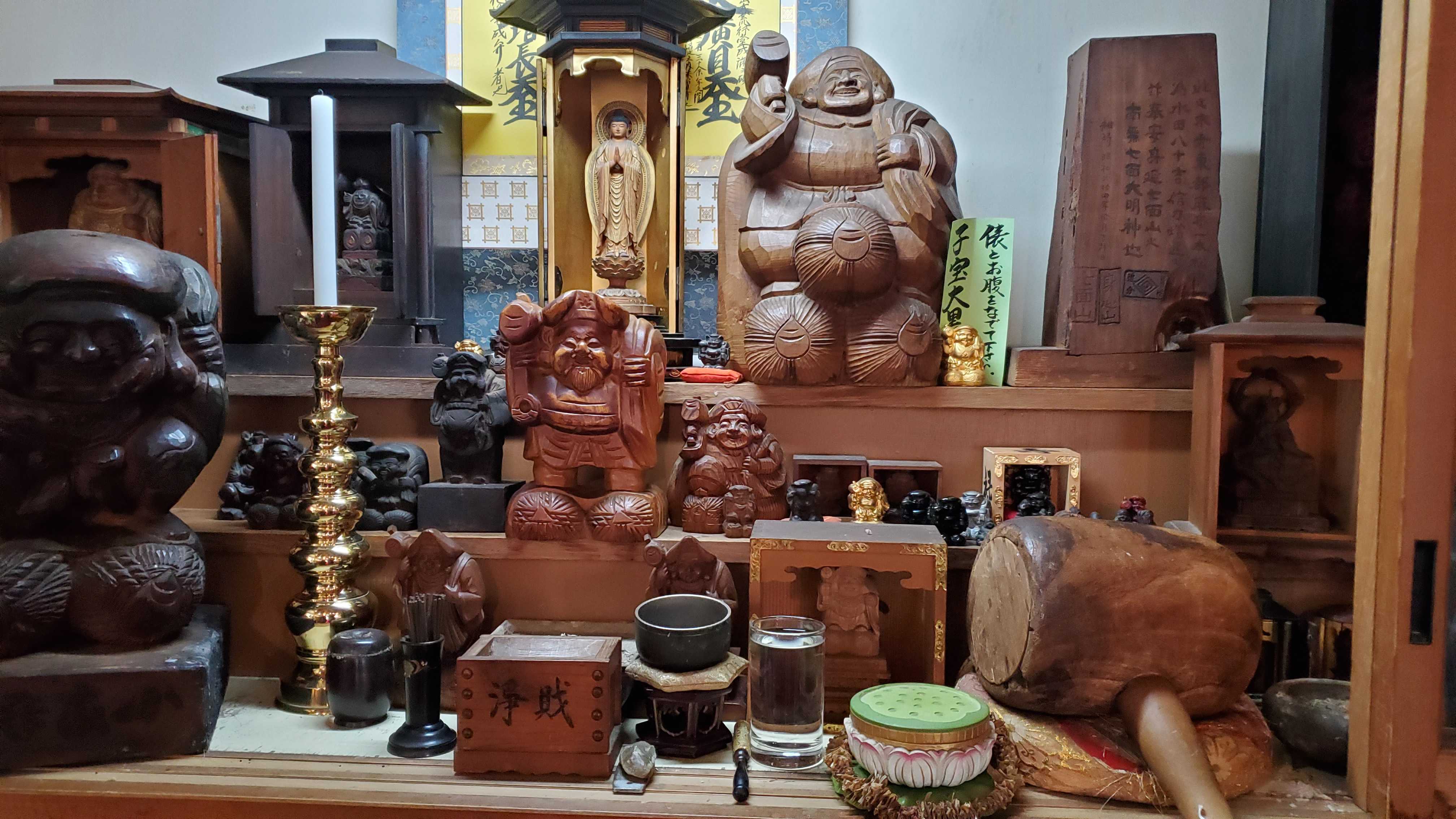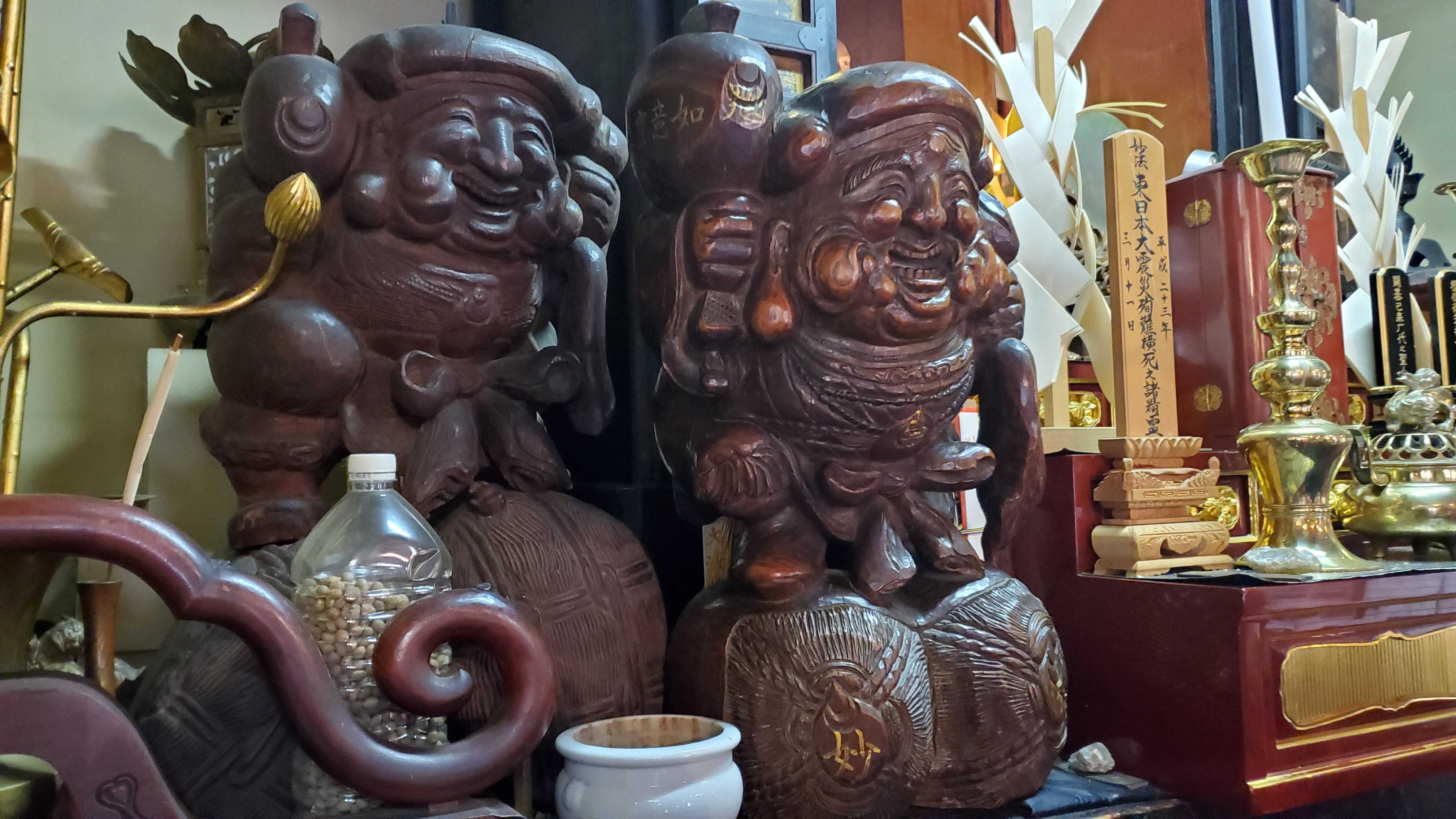 5世妙乗院日亮が伝教大師作と伝えられる三神具足の大黒天を祀り、縁日にはとても賑わったとのことですが、現在もご開帳の正月には行列ができるそうです。 三神具足の大黒天は、 写真右隅に隠れながら写っている厨子に納められています。とても小さく黒くなっていると。 三神具足とは、七福神の中で仏教の神である三神「大黒天の福寿」「弁財天の円満」と「毘沙門天の除災得幸」をその姿があらわしているそうです。大黒天の小槌を持ち、弁財天の髪に毘沙門天の鎧を身に着けているのかしら?