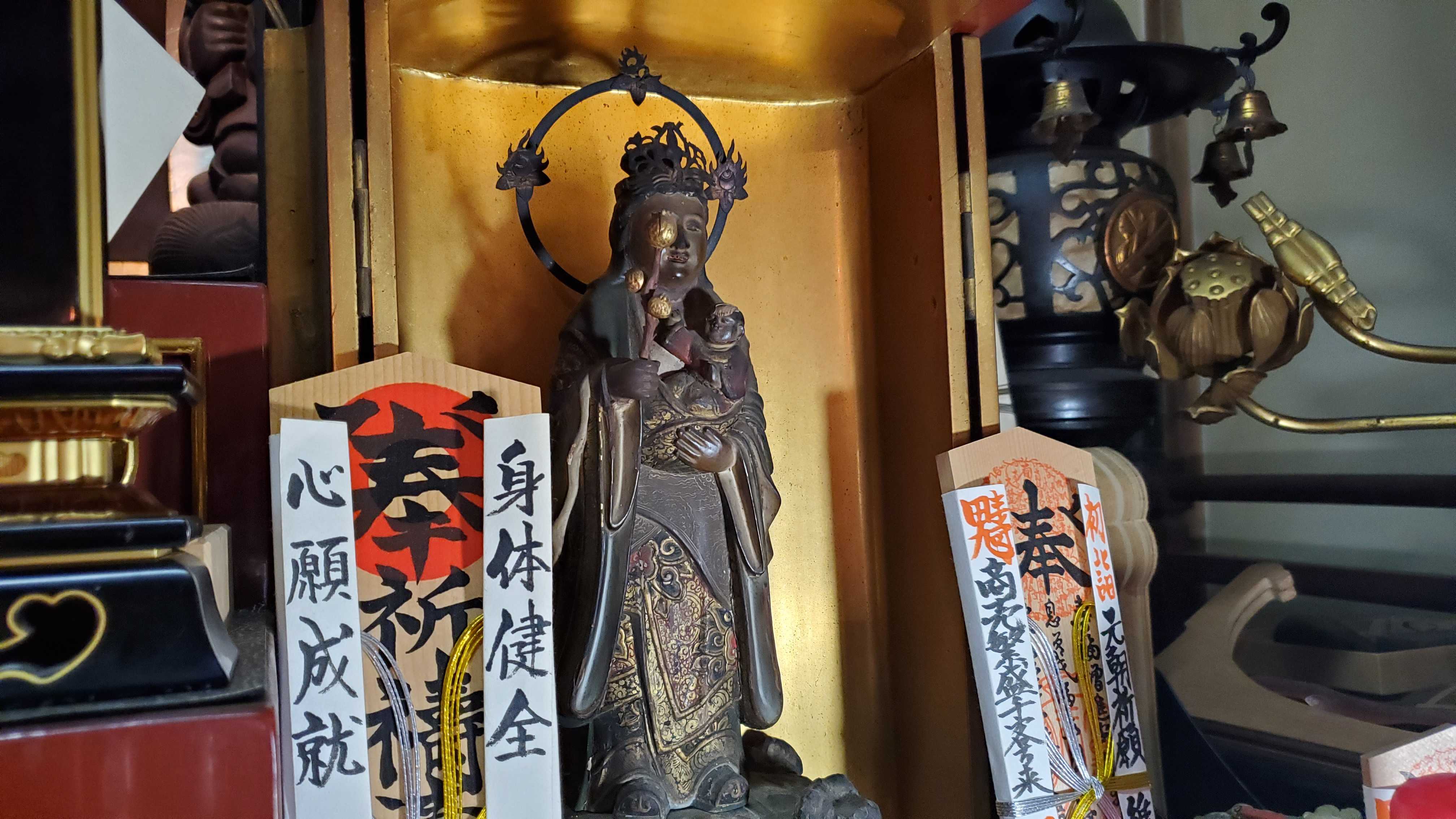 鬼子母尊神はご開帳……古くて小さい。千葉から来たそうです。左の扉に「正中山」とあるから「中山法華経寺(市川市)」から譲られたのかも。