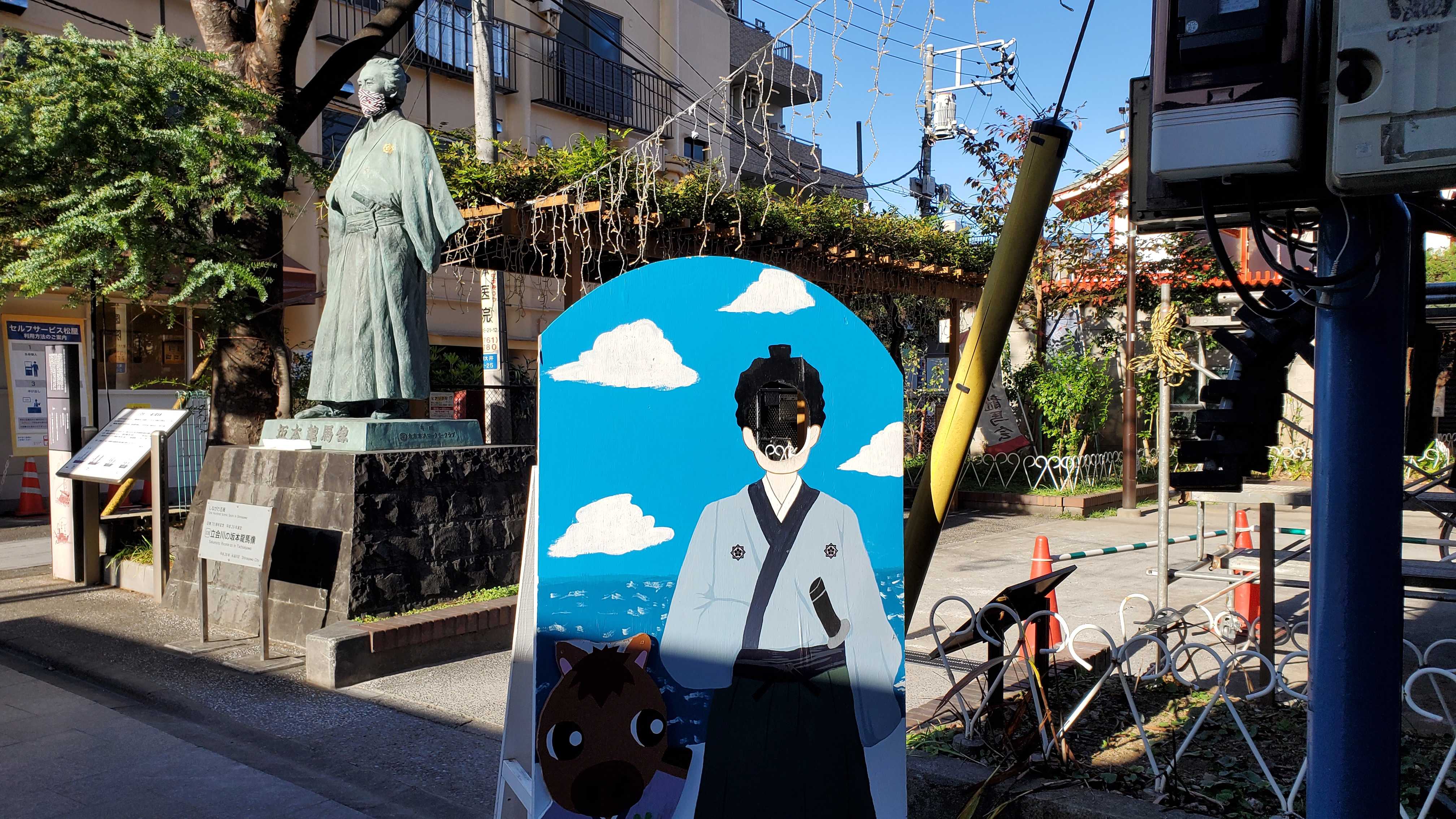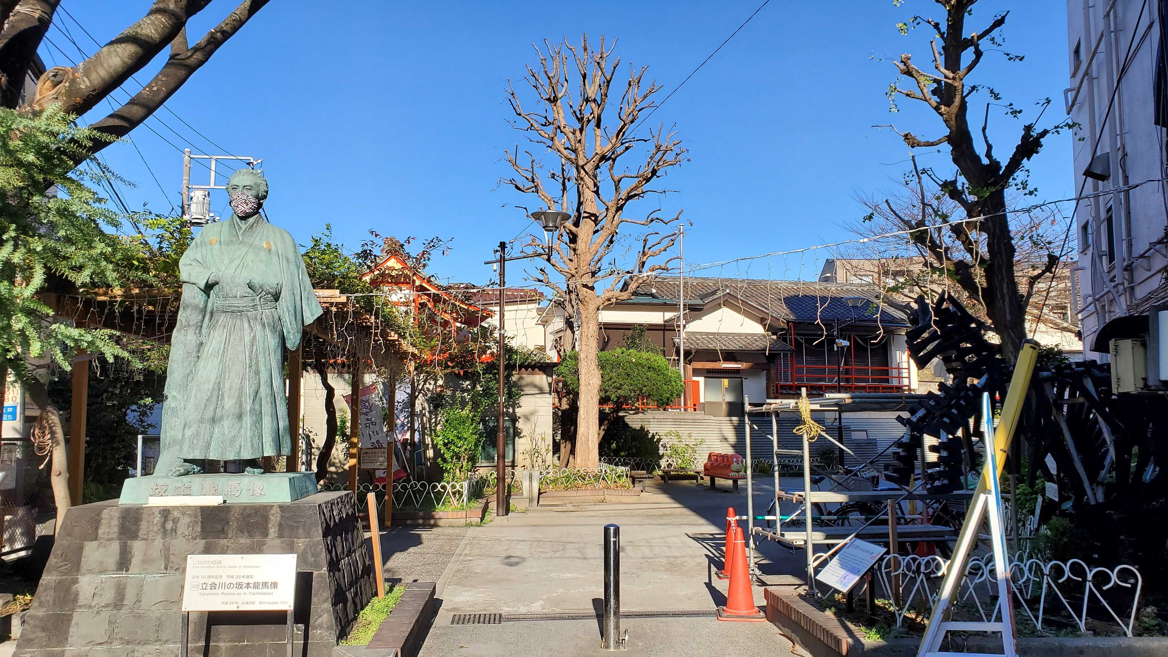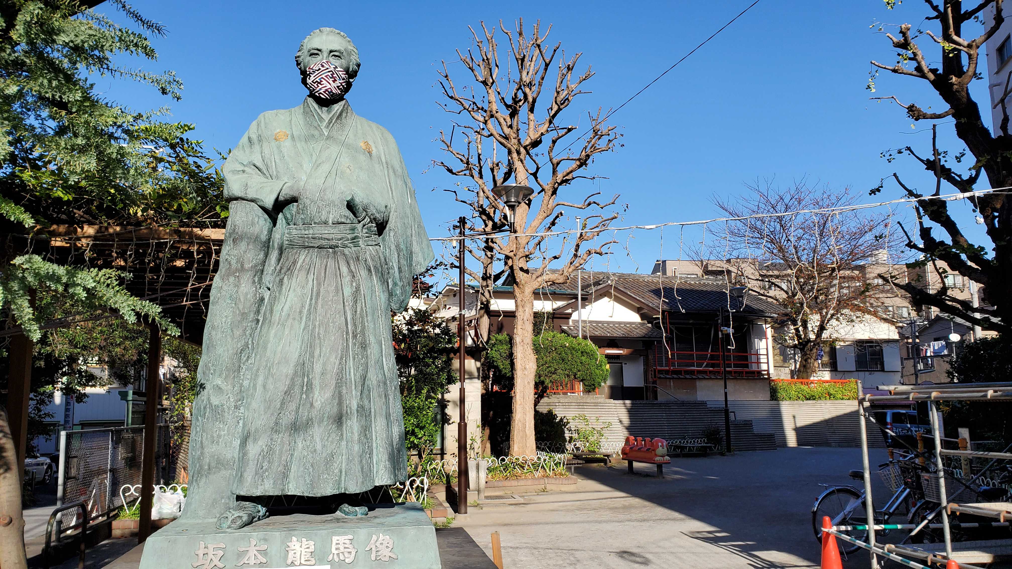 立会川の坂本龍馬 ブロンズ 像・しながわ百景……洒落たマスク着用!!