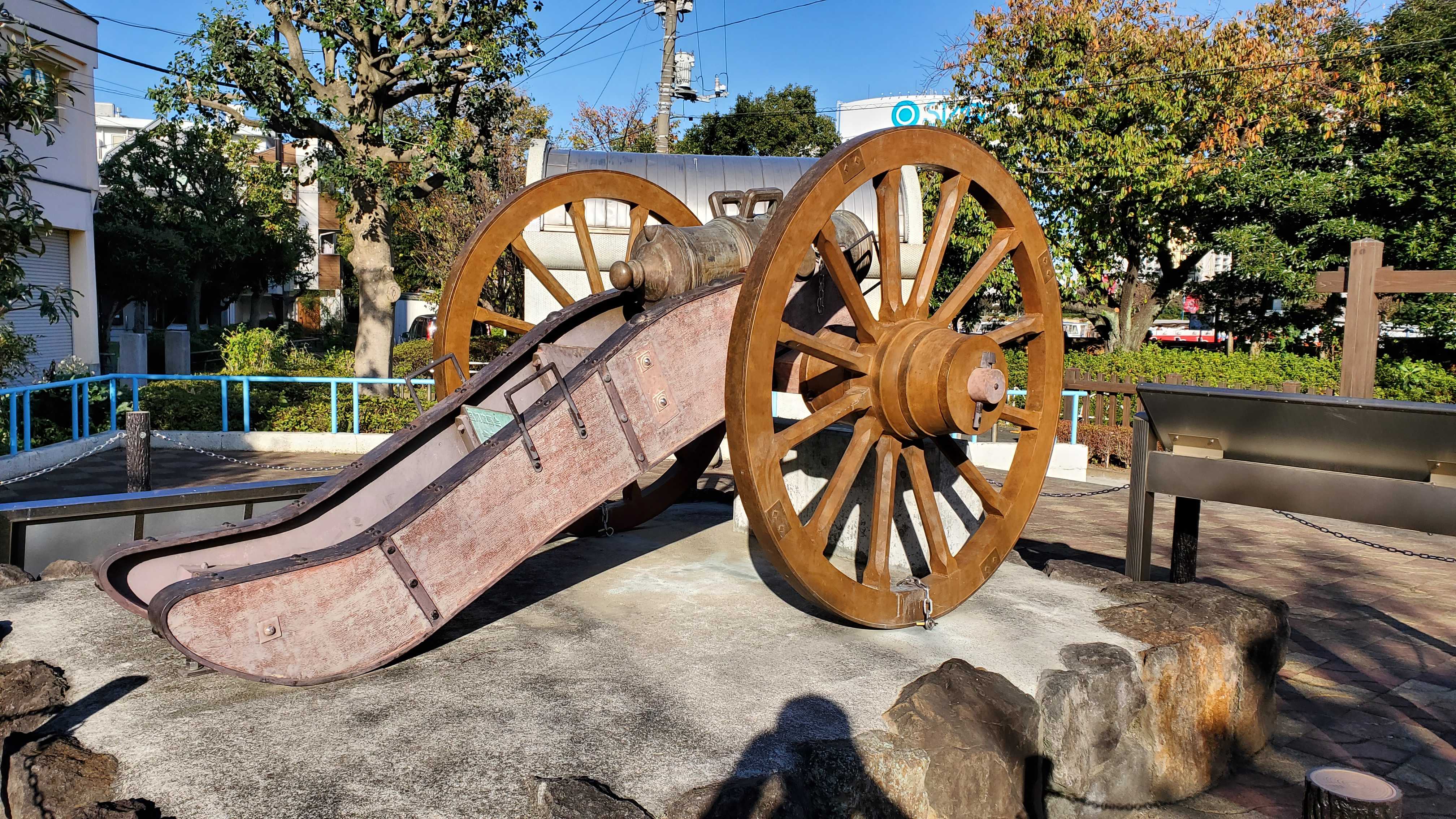 『新浜川公園に平成27年(2015年)に復元設置された「浜川砲台の大砲」は、この砲台に据えられた8門の大砲のうちの1つ「6貫目ホーイッスル砲」を原寸大(全長3メートル、車輪の直径1.8メートル)で再現したものです。』 (しながわ観光協会より)