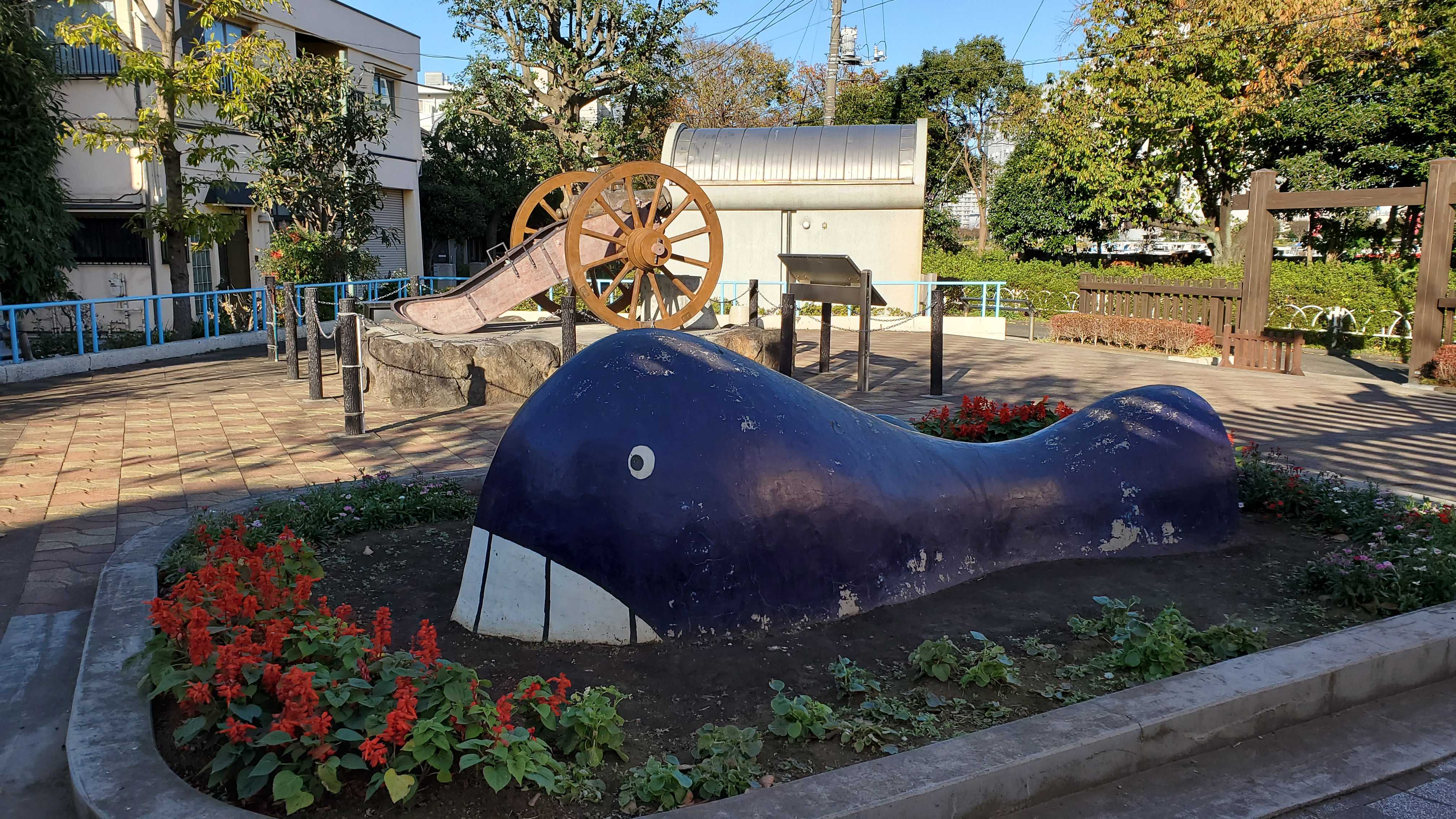 花壇の真ん中だから、子供たちはクジラへは乗れません。植える植物を少なくするために置いたのかしら?