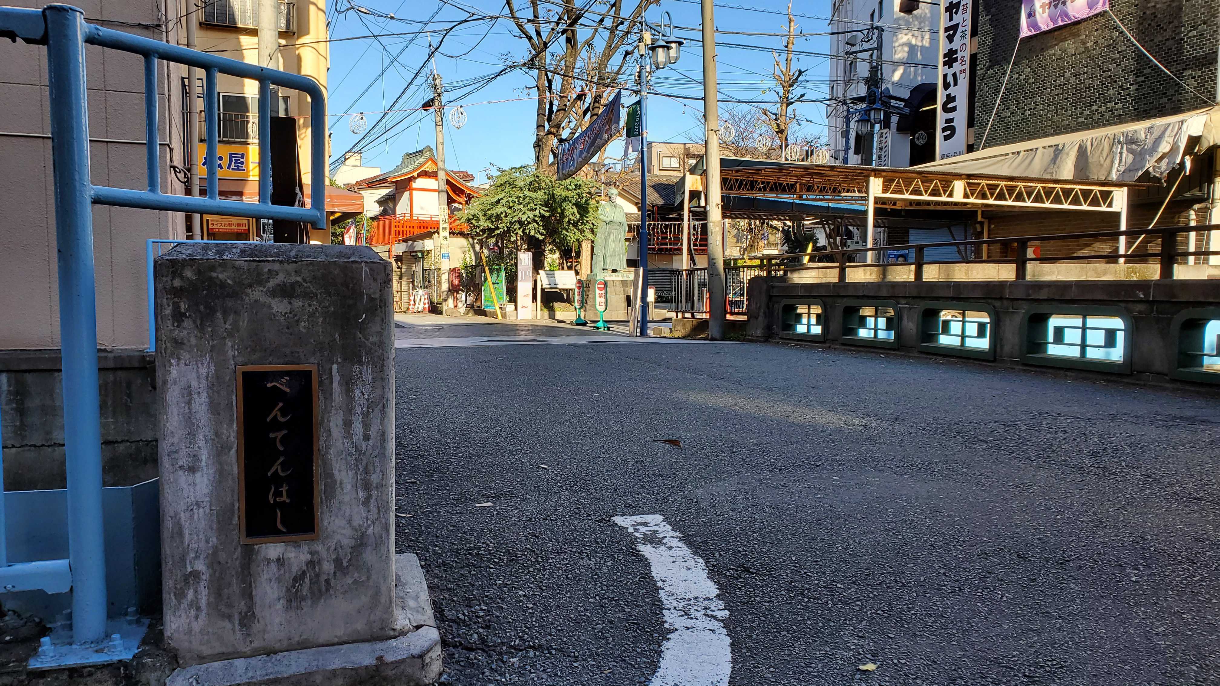 弁天橋……橋の向こうに北浜川児童遊園と仲町稲荷神社