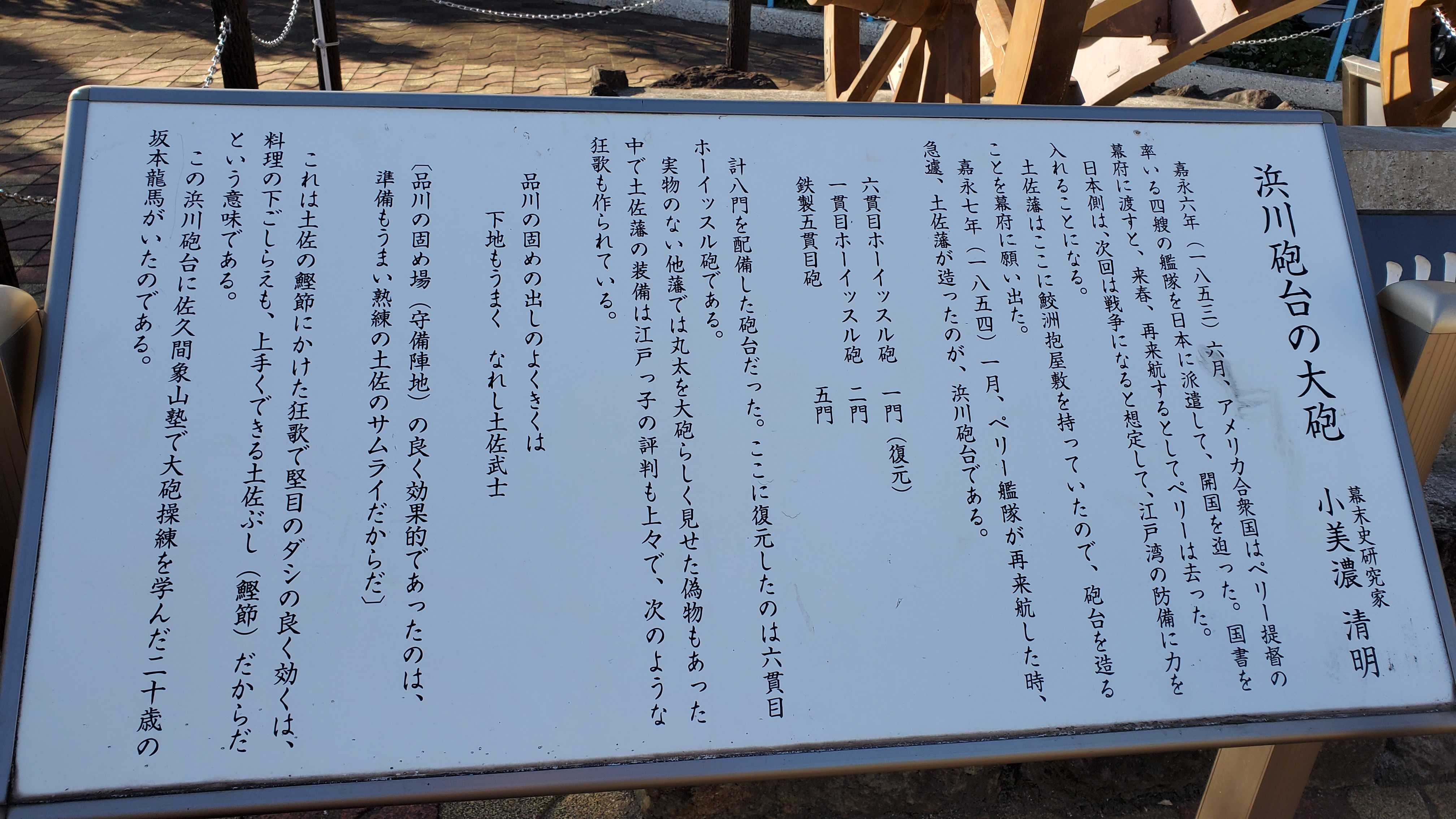 浜川砲台……ここは、万治元年(1658年)頃、東大井のこの地に1万7千坪余りの下屋敷を得た土佐藩の荷上場(当時は脇が海)と国元からの物資保管に使われていた場所。