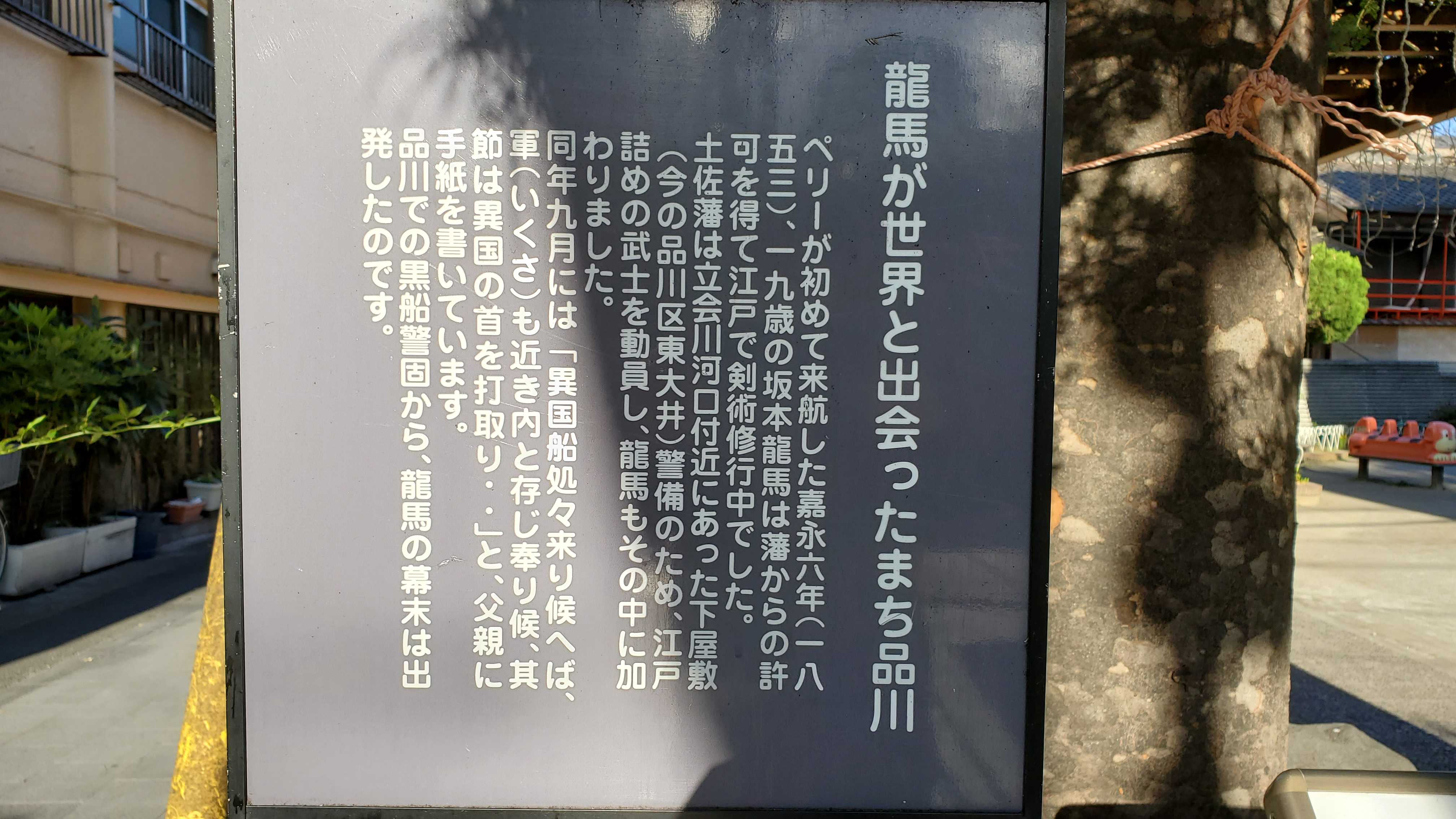 『2010年に京浜ロータリークラブより寄贈されたもので、龍馬が立会川にいたと思われる20歳頃の顔を再現しています。履物もブーツではなく草履と全国的にも珍しいブロンズ像です。2004年に高知市より寄贈された像に続く2代目の龍馬像となります。』(しながわ観光協会より)