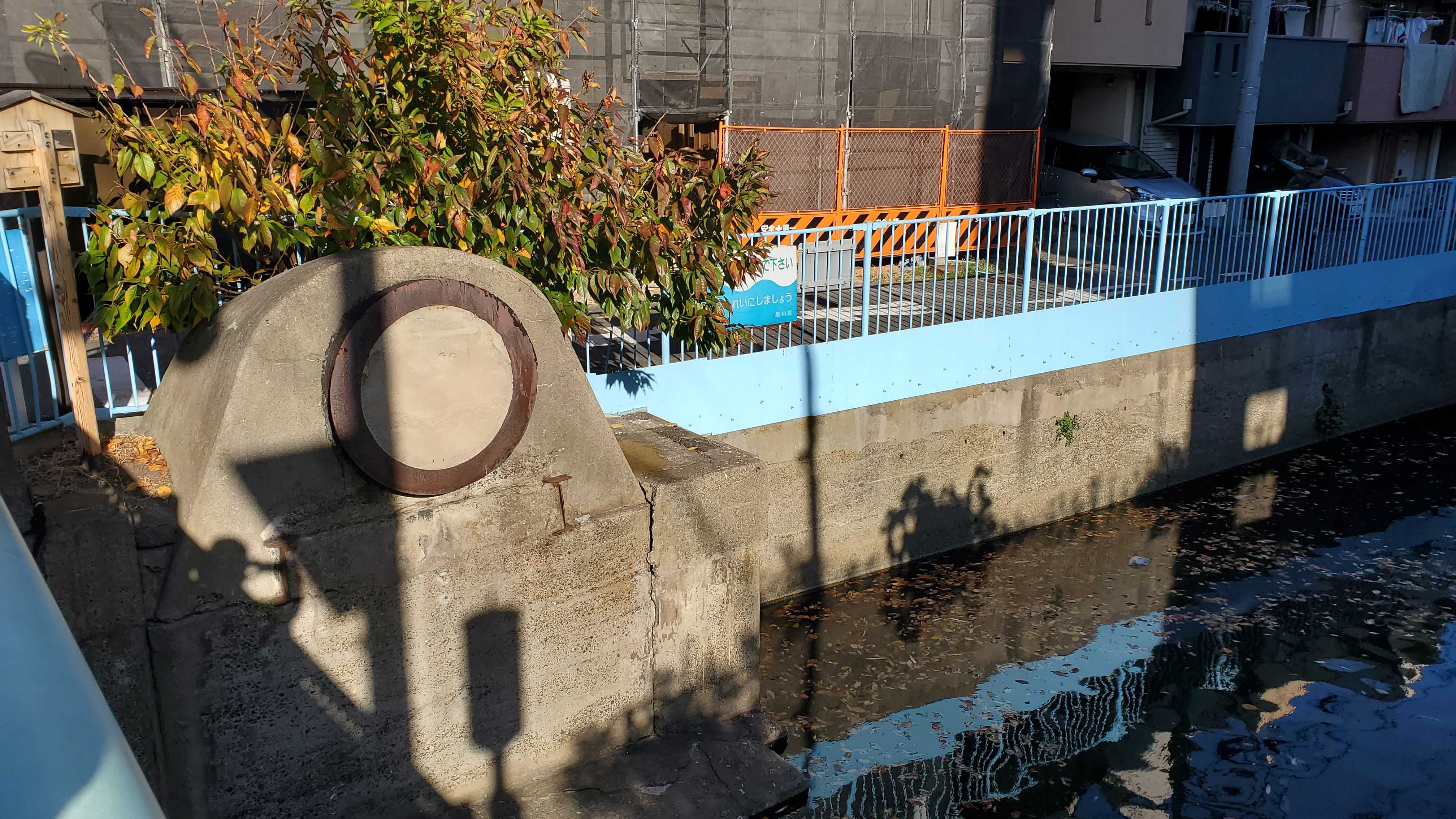 立会川下流……突き当りは人工島の勝島があり、立会川の水は勝島運河から京浜運河を経由して太平洋に出ていきます。江戸時代はすぐそこまで海だったのに……