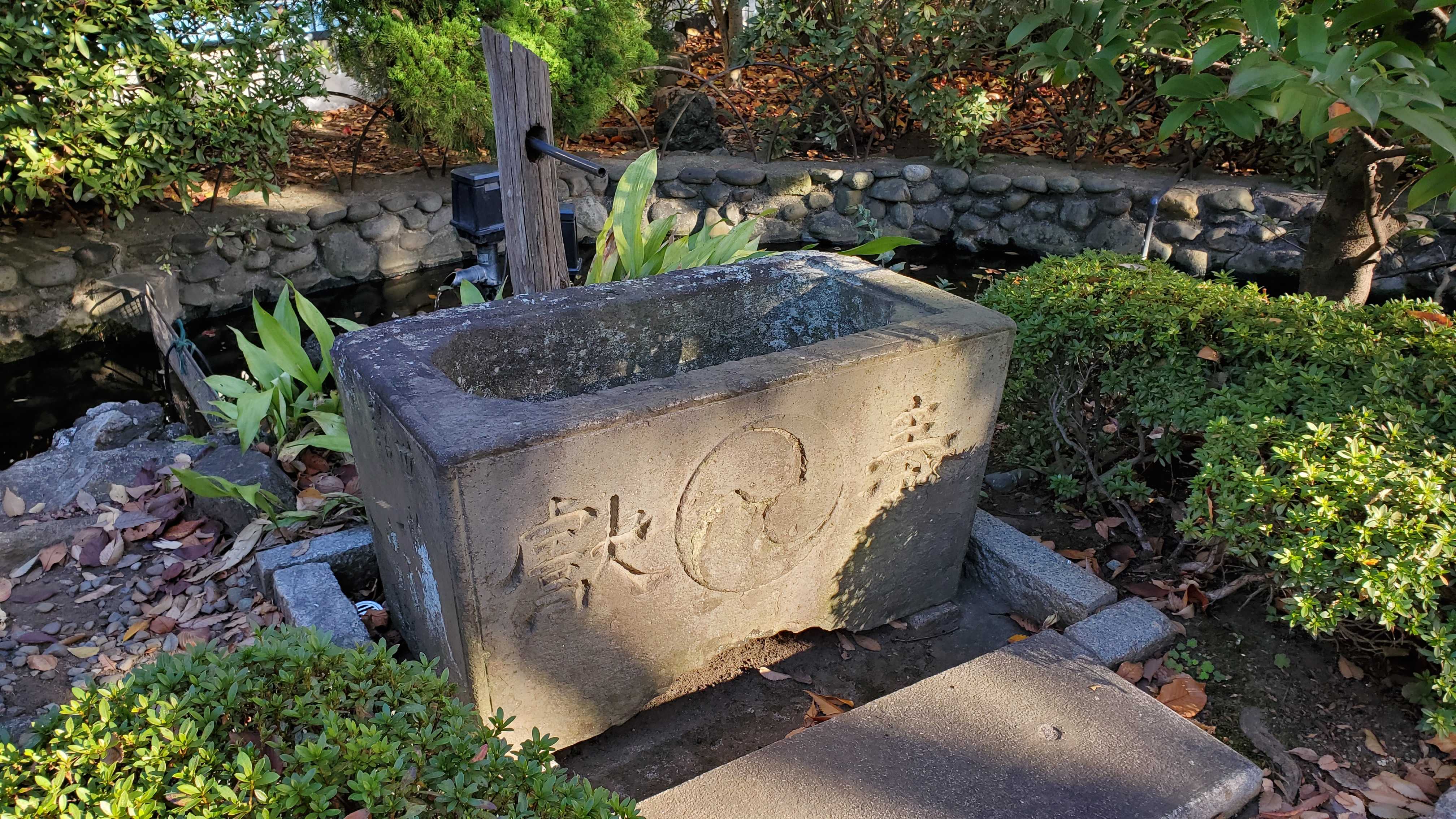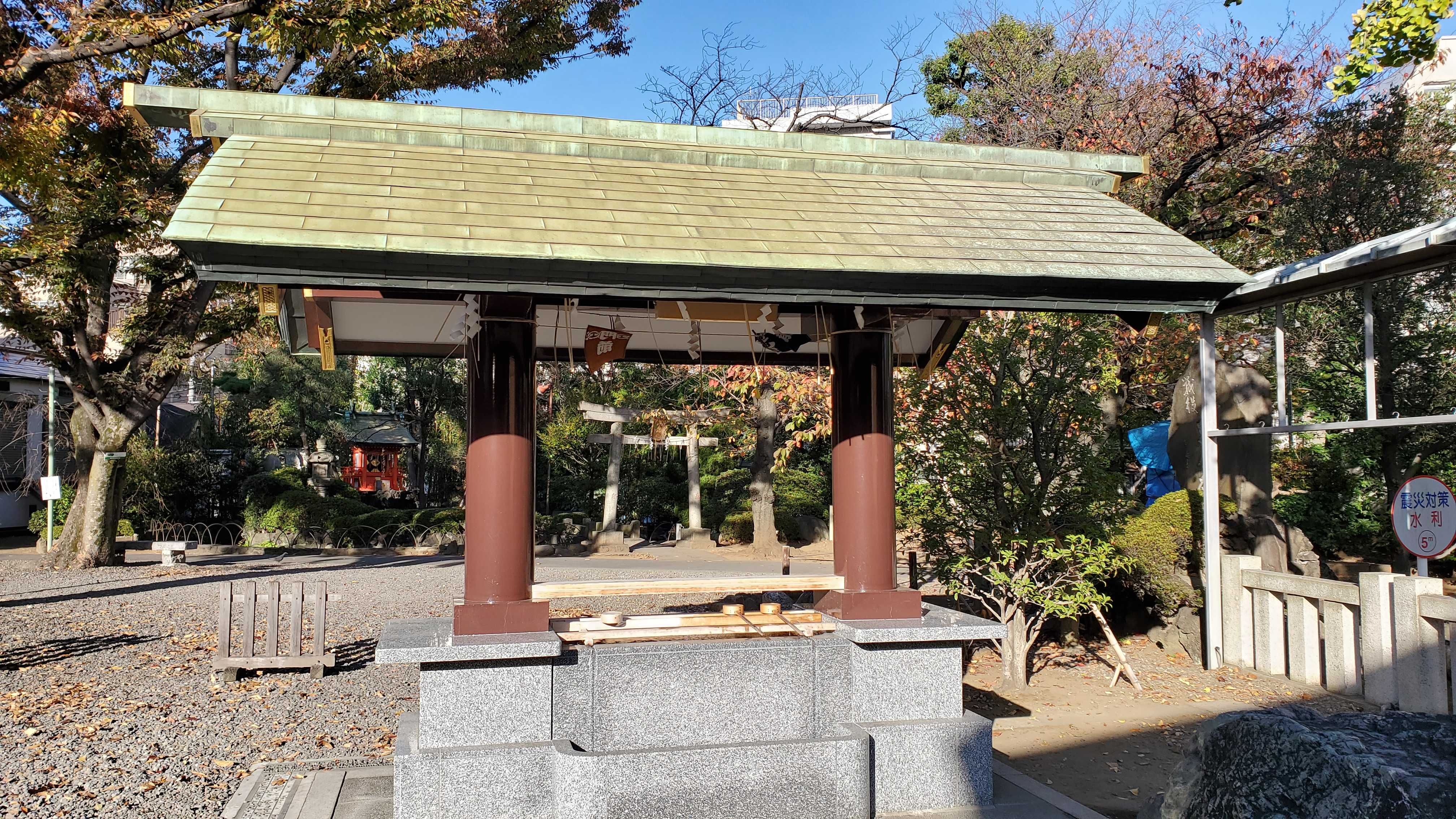 一段高くなった境内に入ると、右に手水舎。後方に鳥居と朱色の社が見えます。