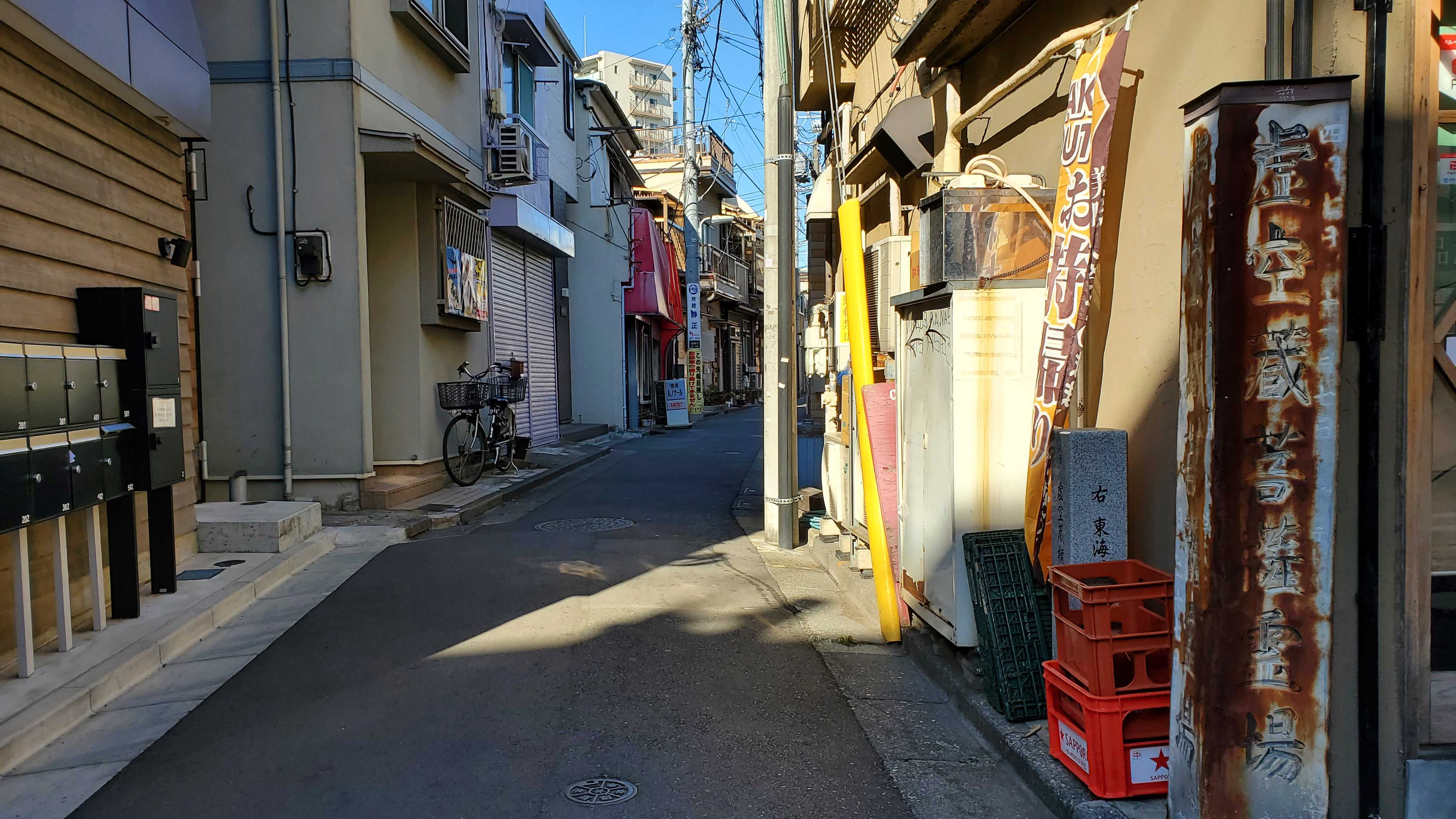 品川神社から第一京浜と京急を越えて東へ……北馬場参道通りって言うそうな。品川神社境内阿那稲荷神社の一粒萬倍の御神水でそそいだお金は、ここで使ってこなくちゃだめでした。
