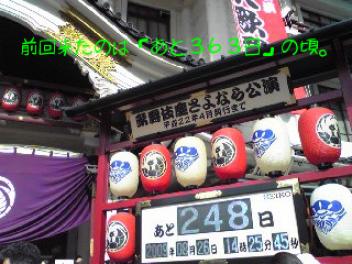 千秋楽の前日。『歌舞伎座さよなら公演』ふたたび…ってなわけで、5月に続きダンナとふたり2度めの同公演観劇へ。平日にも関わらず、歌舞伎座前には早くから観客が集まり思い思いに建物を撮ったり、カウントダウンの掲示板前で記念撮影したり…着物やちょっとフォーマルな装いの人も多くいて、“特別な時間”を共有する仲間達の中で、毎回こうして始まる前から徐々に私達のテンションも上がってく。この時期は、毎年恒例好評の『八月納涼大歌舞伎』と題した夏芝居が行われているらしく、この建物で最後の夏を迎えた今年が節目の20年目。後で知ったのだが、この日歌舞伎座がリニューアルについての詳細を発表し、最近婚約してお目出度い中村勘太郎が、年末に【六代目勘九郎】を襲名することも公表したそうで。そんな良き日に勘太郎&勘三郎父子競演の芝居を観れたのも、かなりラッキーだったかもしれない。 演目はいつものパターンとは異なり、三部制興行の形をとっており、通常の大掛かりな舞台に比べ、時間もやや短めでシンプルな構成。私達が観たのは、第二部にあたる二作品だった。第一幕は、『三遊亭円朝口演より 真景累ヶ淵~豊志賀の死~』第二幕は、新歌舞伎十八番の内『船弁慶~長唄囃子連中~』前者は、福助、勘太郎&勘三郎父子の絡みに注目。後者は、福助、橋之助、三津五郎などもいいが、勘三郎の最後の演技が大きな見せ場。どっちも霊が出てくるちょっぴり怪奇もので、そんなところにも納涼歌舞伎の工夫が見られて面白い。安い席で動きの全部を見渡せないところがあって、残念だったが長年の夢叶って、勘三郎の生の演技を観れたので満足。しかも、休憩中これまた私達の恒例になってる「めでたい焼き」は、何度頬張っても皮がカリッカリでうまいー!!ついに閉鎖まで1年を切ってしまった歌舞伎座。さーて私達は一体、あと何回さよならできるか。乞うご期待♪♪♪★ ★ ★ ★ ★今日のひとこと。「人ひとり亡くなってるのに。結局は金ですか。」
