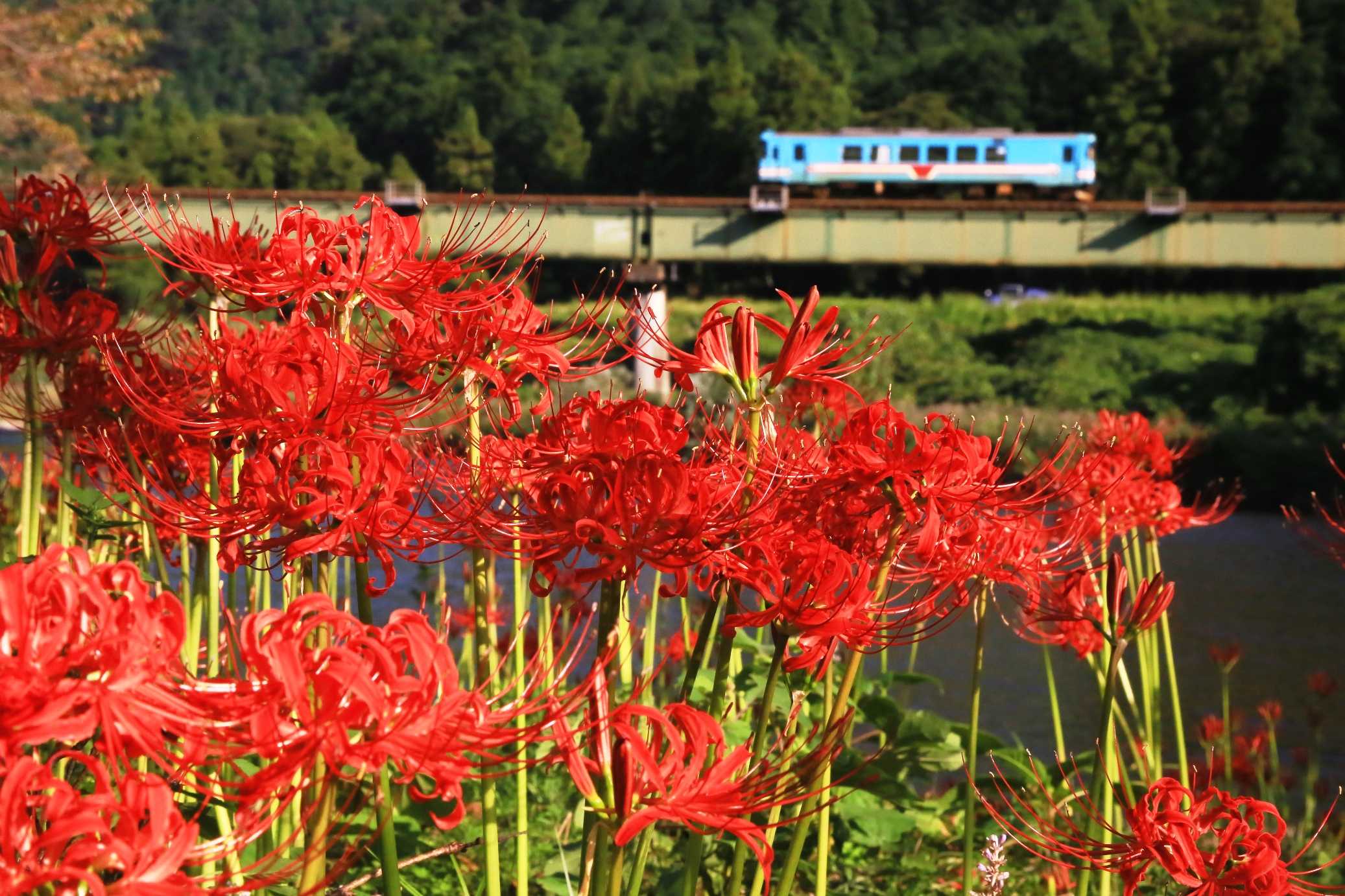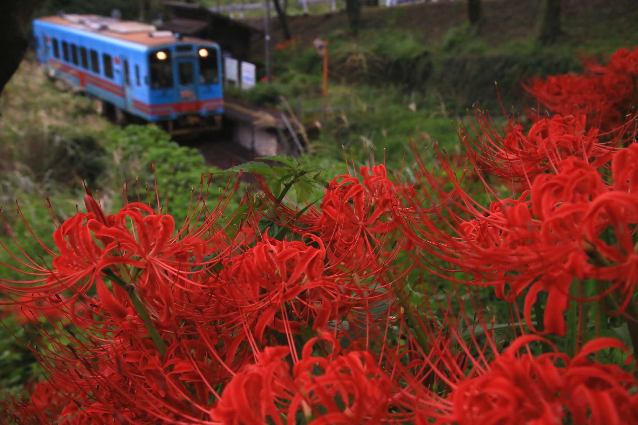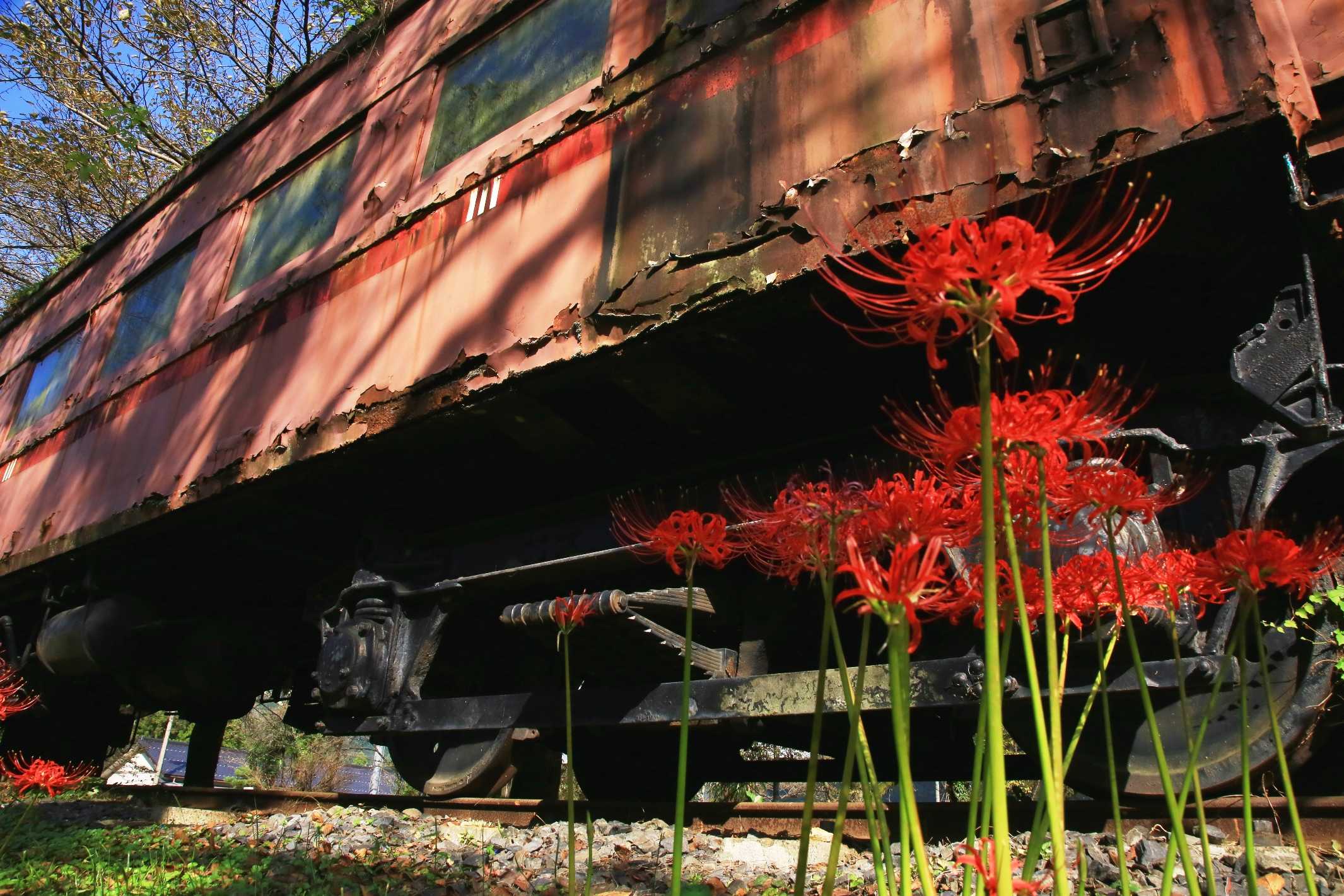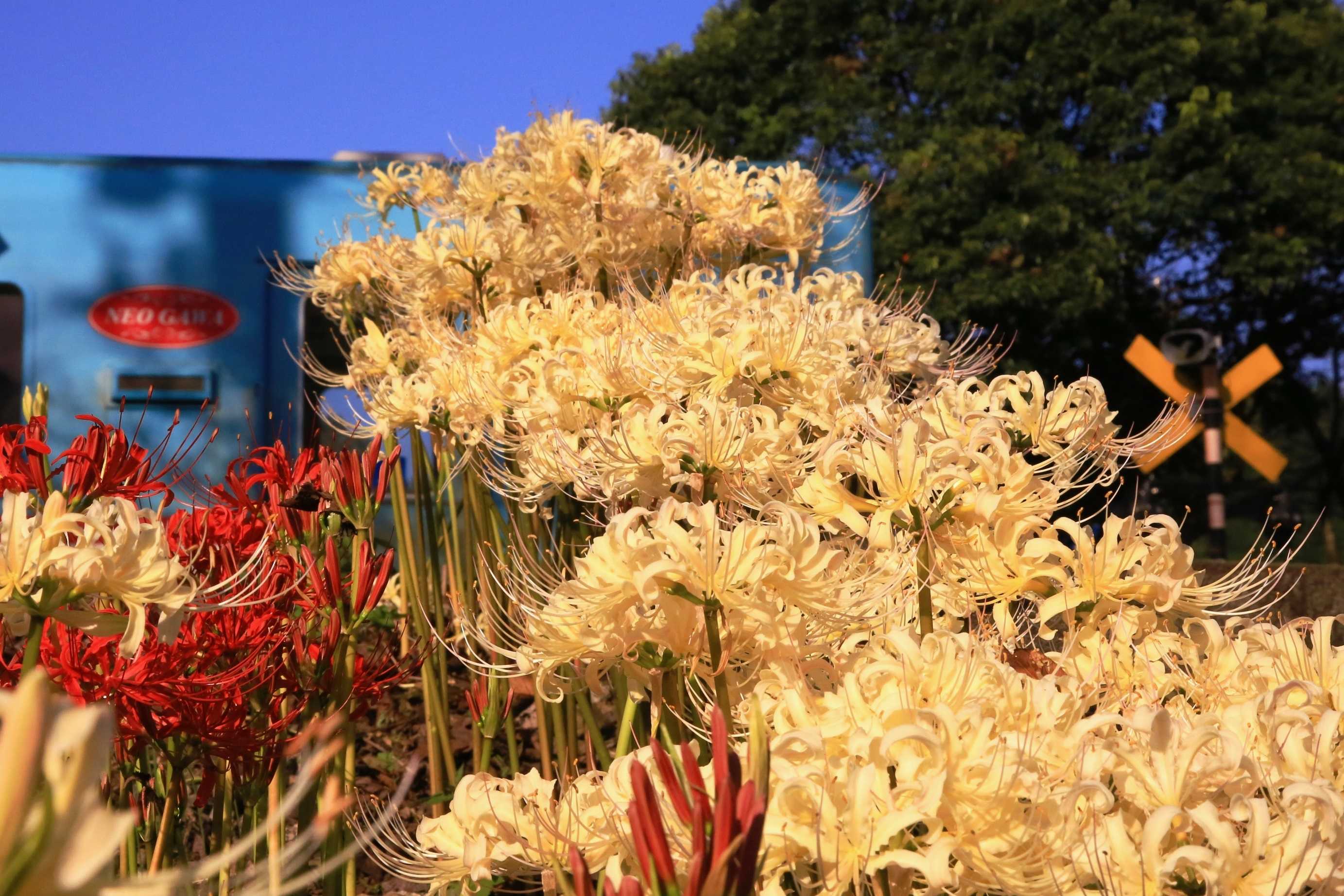 ちょっと苦しい!? 構図でしたが、白い彼岸花がたくさん咲いていたので、花をメインにして、列車は脇役!?。。 (トリミングあり)