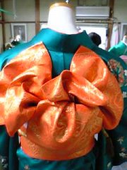 今週も震えながらお稽古に行った。今日は、名古屋帯のお太鼓と袋帯の花篝。長襦袢を着た状態から15分で着物を着て、お太鼓をした。時間的には問題ないけど、慌てるとお太鼓が美しくない。しかも、名古屋帯を忘れて学院のを借りた。ちょっとすべる帯で結びにくいしー。出来上がったら、さっさと外して花篝。(笑)振袖にぴったりのミスの帯結びで割と簡単。ちょっとアレンジして、来年の成人式にやってみようかなぁ。来週は二重太鼓と他1点。各自ささっと出来る帯結びを1点考えてくるのが宿題。成人式に結んだ帯結びにちょっとアレンジしていこう。日曜日にちょこっと練習しよう。そうして、足袋は未完のまま・・・・。(謎笑)