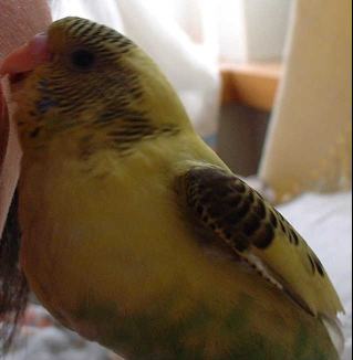 「ん?」風切羽が長くなってきて交差しています。フォーミュラーがコペコペです。セキセイインコの写真がたくさん載っている本をみていて気が付いたのですが、他の小鳥さんは前頭部が黄色で後頭部がシマシマになっているのがほとんどで、プリのように前頭部がシマシマで後頭部が黄色というのはいなかったです。なんで~?ほんとうはたくさんいるけど、写真の見栄えが悪いから載せていないのかしら?人気blogランキング参加中です みなさんのインコちゃんのブログもあります