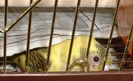 昨夜10時ころの出来事です。ネットサーフィン中にプリのカゴがなんだか騒がしいなあ・・と、ふとカゴにかけてあった布をめくってのぞいて見るとプリがエサ箱と止まり木にはさまって窒息しそうになっているではありませんか!!あわててカゴに手をいれてプリを救出しました!エサ箱と止まり木の間が少しあいていましたが、どうやったのかプリの体がすっぽりはさまって抜けなくなったらしいです。(下から上に上がろうと思ったのではないかと想像しています)気が付かなかったら、もしその場にいなかったら死んでいたことでしょう。セキセイインコって何するか本当に危ないです。輪ゴムで遊んで窒息死、してたなんて話しを聞いたことありますし。あれからすぐエサ箱と止まり木の間は隙間なくし・・心配なのでカゴについていたブランコもはずしました。心配させないでよ~プリ。まだ粟玉与えてます(朝夕のみです)今日は水浴びをしてめちゃ濡れました~水浴びしたところ見ていないですが、どうやってしたんでしょうすごい顔です。(頭から水をかぶったのでしょうか)人気blogランキング参加中です みなさんのインコちゃんのブログもあります