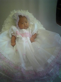 この前の日曜日、ようやくお宮参りに行ってきた生まれた日も、大雨だったけどお宮参りの日も大雨でこの子、雨女の素質十分かも(笑)その後で、写真館で写真を撮ったんだけどまぁ、似合わないこと、似合わないこと(笑)思わず、そこに居た家族(うちら家族&旦那の両親&うちの両親)みんなが鼻で笑ってしまった。ごめんな、みぃーぼう。でも、お宮参りの神社では大きな太鼓の音にも反応する事なく寝続けたのに写真館では、ぱっちり目を開け「どんとこい!」精神でバシバシ写真を撮られてた(笑)将来、どんなお子になるのやら・・。