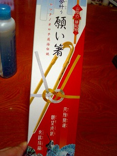 この前の週末は、うちの実家にみんなで泊まってたんだけど朝、起きてみたらうちの母親が「あんた、当たってるじゃん」ってなんの事かさっぱり分からなかったら地元の新聞に載ってたプレゼントコーナーの当選者のとこにうちの名前があるって。そういや、以前当たった事に気をよくした母親が「あんたの名前で出すけど、何がいい?」って言ってたっけ「夢が叶う願い箸」ってのがあったから何気なくこれがいいって言ってたっけねそれが当たったみたい。その前の週は、母親の名前で当たってたしそんなに少ないのか、母親が今まさにツキまくってるのか。その「夢が叶う願い箸」今日、ようやく到着しました「山陰の縁起物 夢叶う願い箸」だって。さらに「厄除開運」「願望成就」「良縁招福」「家内安全」「健康長寿」「子孫繁栄」とも。神棚に飾っておくべきかね?