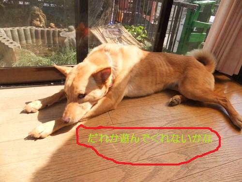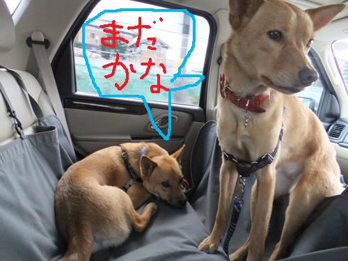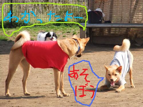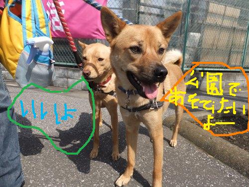 昨日、いつもの大間木ドッグランに行きました。まず、いつもならリードを離すと最初に走り出すのに、昨日は疲れたような感じで走りませんでした。ちょっとすると、すごく暑くなってきました。僕は4枚着込んでいたのを、全部ぬいで裸になってしまいました。裸だとはずかしいので、肌着の上に着ていたTシャツを着ました。ゴロウ、ハナも暑そうだったので、頭に水をかけてあげました。待っていたら、友達が二人来ました。ちょっと風が吹いてきたので、着替えました。ゴロウ、ハナは友達とそんなに遊びませんでした。僕が抱っこして友達のところに連れて行っても遊びませんでした。遊ばなくなってしまったので、帰りました。昨日はメチャクチャ暑かったので、少ししか走らないのはあたりまえだと思いました。