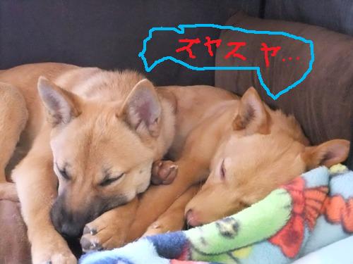 今日はゴロウ、ハナの子犬の頃のことを紹介します。ゴロウ、ハナは2010年の12月にライフボートさんという里親会から引き取りました。最初、譲渡会を見に行きました。白い子犬とかこげ茶の子犬とかがたくさんいたけれど、その中で大きめの子犬が二頭、ケージに入っていました。抱っこしていいですよとスタッフの人に言われたので、二頭のうちちょっと小さい子(ハナ)を抱っこしました。次に大きめの子(ゴロウ)を抱っこしたら、重かったから持ちあがりませんでした。ゴロウは鼻が真っ黒でかっこよかったし、ハナは毛が金色に光っていたので、僕はとても気に入りました。その後、家に戻って、話し合いました。お母さんは二頭は無理だよと言っていたんですが、僕とお父さんがあの二頭がいい!と説得して、「僕がちゃんとお世話するから」と話しました。それで僕とお父さんがクリスマスイブの前の日にゴロウ、ハナを連れてきました。オサムとミニという名前で里親会では呼ばれていたのですが、僕たちでゴロウ、ハナという名前に変えました。僕は、犬を飼いたいと二年間ずっと言っていたので、願いがかなってうれしかったです。子犬の頃、仲良く寝ているところ。僕の家にはカチという猫もいます。18歳です。ゴロウ、ハナとはまだ仲良くできていません。でも仲良くなってくれたら、うれしいな