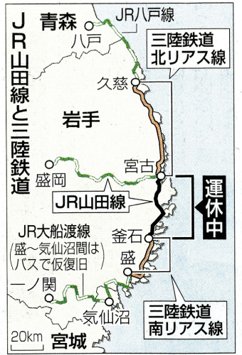 被災運休のJR山田線 三陸鉄道に移管合意へ2011年3月の東日本大震災で被災し運休が続く岩手県のJR山田線宮古―釜石間(55・4キロ)の復旧策をめぐり、県と地元沿岸12市町村などでつくる首長会議は24日午前、盛岡市で会合を開き、JR東日本が提案している第三セクターの三陸鉄道(宮古市)への移管を受け入れることに合意しました。震災でレールや駅が流されるなど大きな被害を受けた宮古―釜石間について、JR東日本は今年1月、同区間を挟む形で北リアス線と南リアス線を運行する三陸鉄道への移管案を提示。地元側は受け入れの条件として、移管後の赤字補填(ほてん)支援などを求めました。これに対しJR側は、同区間の復旧費用約210億円のうち約140億円の負担に加え、移管後の赤字や三陸鉄道との運賃差額の補填分として移管協力一時金30億円の提供、車両の無償譲渡、レール・枕木の交換、検修庫・施設管理拠点の整備などを行う方針を示していました。会合後、達増拓也岩手県知事は記者団に「鉄路復旧は地域づくりの核になる。一日も早く工事をスタートさせてほしい」と話しました。三陸鉄道も震災の影響で一部区間で不通が続きましたが、今年4月に全線での運行を再開しました。「しんぶん赤旗」日刊紙 2014年12月25日付掲載三陸鉄道は頑張って北リアス線、南リアス線を復旧しているのに、力のあるJR線の復旧が遅れていることに不満の声がありましたが・・・。やっと復旧のメドが立って、被災地に朗報ですね。