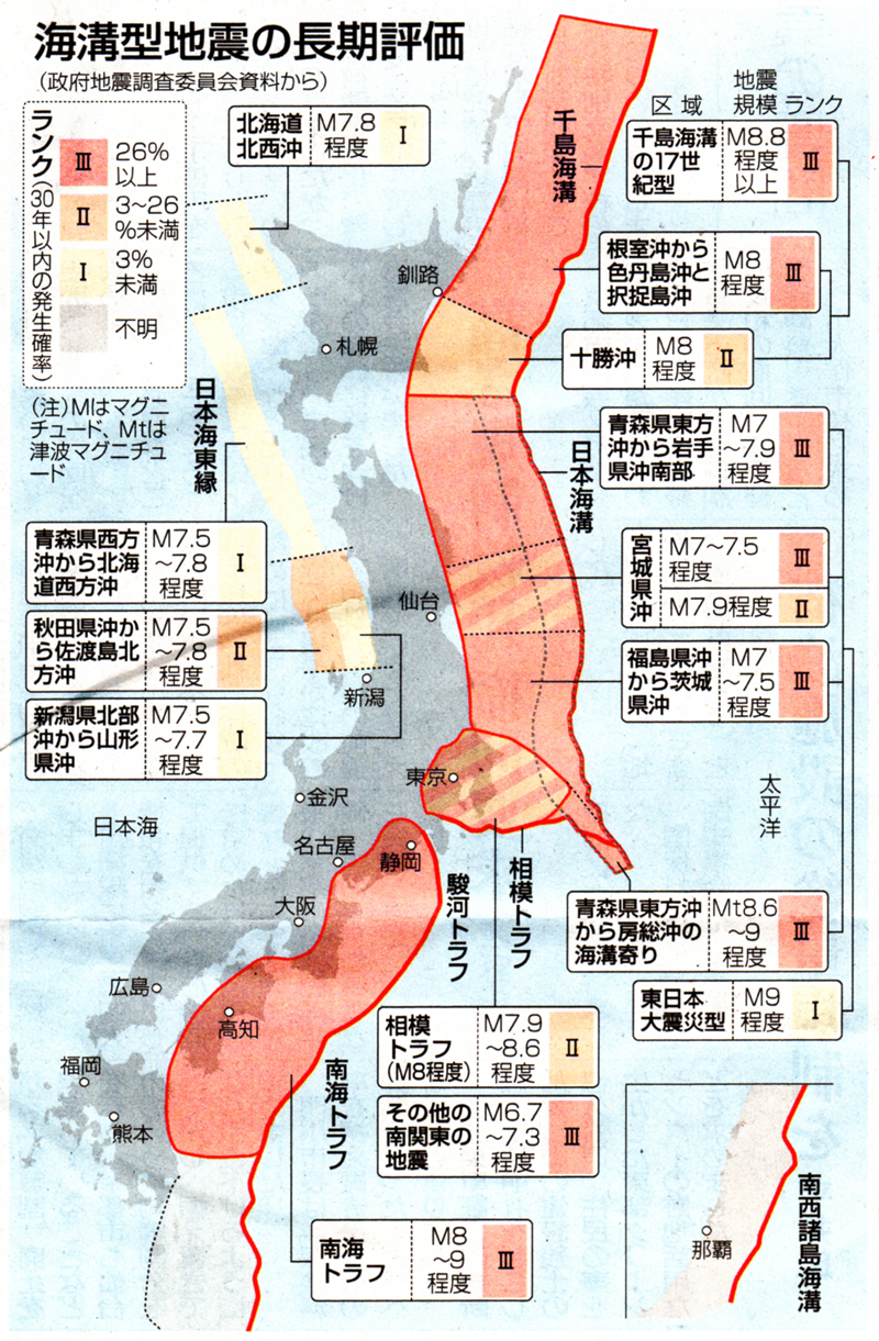 日本海溝沿いの地震 30年内 M7~8弱「高確率」長期評価更新政府の地震調査委員会は2月26日、日本海溝沿い地震の長期評価を更新しました。東日本大震災と同じマグニチュード(M)9程度の超巨大地震が今後30年以内に起きる確率は、前回評価から変わらず、ほぼ0%とされました。しかし、M7~8弱の地震について同確率を3段階にランク付けすると、青森県沖から茨城県沖の大半の区域が最も高いⅢ(26%以上)に分類されました。今後30年以内の地震発生確率評価対象区域確率前回評価(11年11月)東日本大震災型超巨大地震(M9程度)岩手県沖南部から茨城県沖ほぼ0%プレート間巨大地震(M7.9程度)青森県東方沖と岩手県沖北部5~30%宮城県沖20%程度ほぼ0%一回り小さいプレート間地震(M7~7.5程度)青森県東方沖と岩手県沖北部90%程度以上90%程度岩手県沖南部30%程度―宮城県沖90%程度―陸寄り(M7.4程度)50%程度―福島県沖50%程度10%程度茨城県沖80%程度90%程度以上海溝寄りのプレート間地震(Mt8.6~9)全域30%程度沈み込んだ海側プレート内の地震(M7~7.5程度)青森県東方沖から茨城県沖60~70%―海溝軸外側の地震(M8.2程度)7%4~7%(注)政府地震調査委員会発表。Mはマグニチュード、Mtは津波マグニチュード。ランク分けはⅢが最も高く、ⅡⅠの順。確率は2019年1月1日時点平田直委員長は大震災後の調査結果を踏まえ、「M8程度までの地震が起きる可能性は依然として高い。強い揺れや津波がまた襲ってくることに十分注意してほしい」と話しています。確率の計算は過去に起きた同規模の地震の回数や発生間隔に基づきます。ランク付けは今回から導入され、Ⅲ、Ⅱ(3~26%未満)、Ⅰ(3%未満)の順。宮城県沖の巨大地震(M7・9程度)は、2011年11月の前回評価では大震災直後のためほぼ0%(Ⅰ)とされましたが、超巨大地震後に周辺で巨大地震が誘発される可能性などを考慮し、20%程度(Ⅱ)に引き上げられました。福島県沖の一回り小さい地震(M7~7・5程度)は、計算対象の地震の数え方を1600年以降の1回から1923年以降の2回に改め、10%程度(Ⅱ)から50%程度(Ⅲ)とされました。確率が引き続き高いのは、一回り小さい地震のうち、青森県東万沖と岩手県沖北部の90%程度以上、宮城県沖の90%程度、茨城県沖の80%程度。いずれもⅢに分類されました。「しんぶん赤旗」日刊紙 2019年2月27日付掲載南海トラフの巨大地震が危惧されているが、それ以外のプレート境界の巨大地震も危ない。特に日本海溝沿いのプレート境界の巨大地震。近い将来に、再び起こる可能性が大だと。