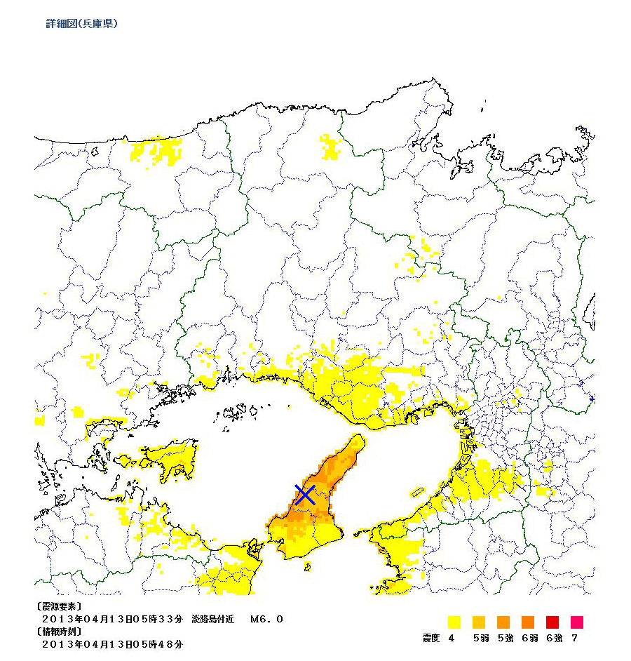 2013年4月13日午前5時33分の地震の震度観測データ。