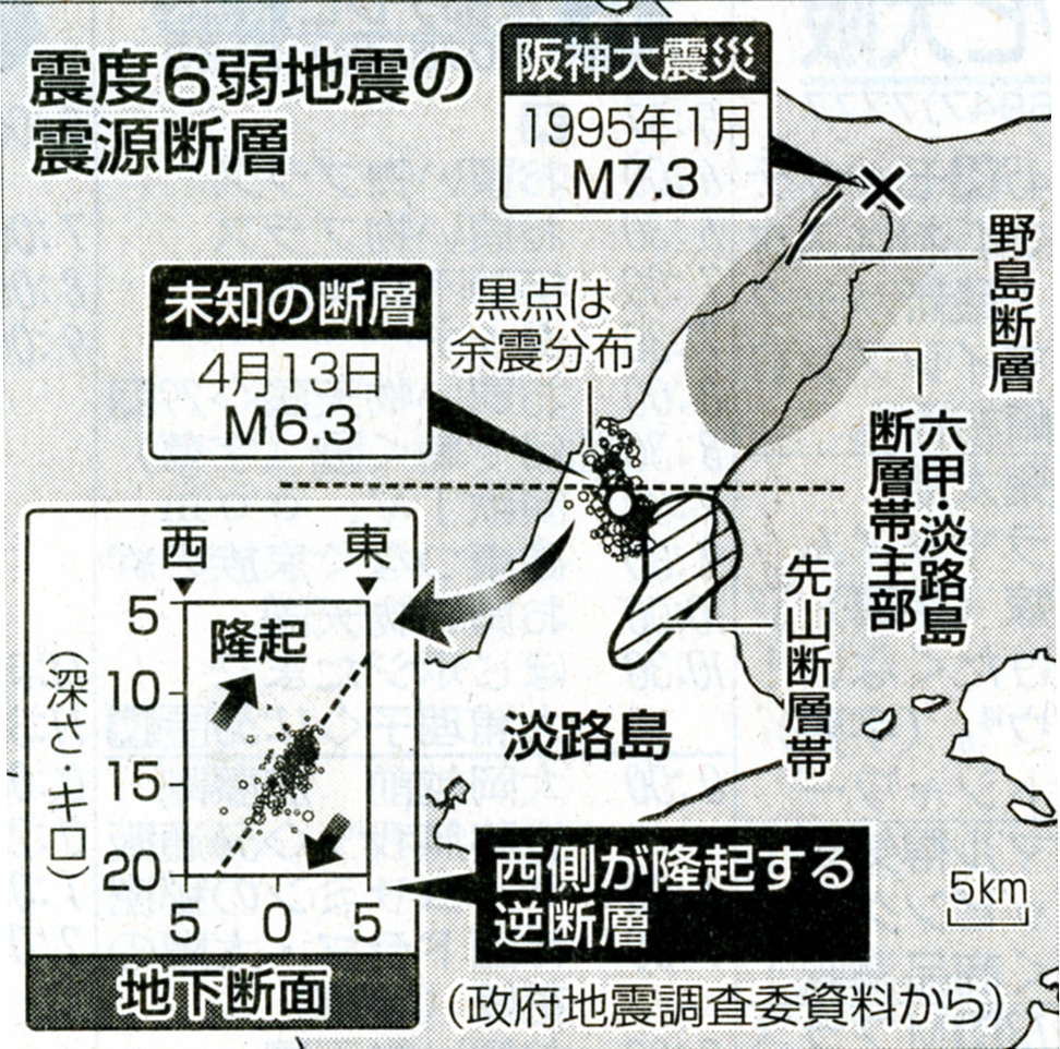 兵庫県・淡路島で起きた最大震度6弱の地震について、政府の地震調査委員会は14日、文部科学省で臨時会合を開きました。阪神大震災の余震域南西に近い部分にマグニチュード(M)6・3の本震や余震の震源が集中分布していることから、深さ11~18キロの所に南北約10キロに及ぶ未知の逆断層型断層があり、西側が東側に対して隆起した可能性が高いと結論付けました。