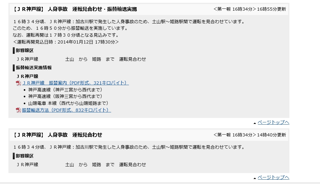 JR加古川駅で発生した人身事故で発車を見合わせているとのアナウンス。また16時50分から山陽電車で振替輸送を始めるとの事。