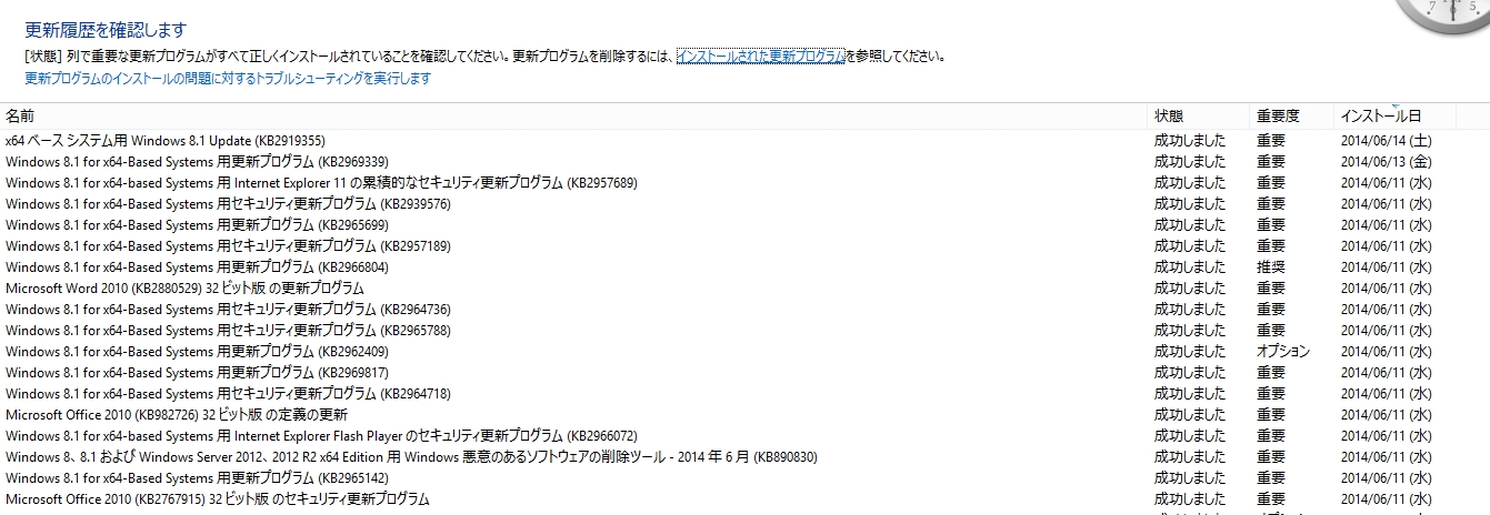 すると、ある日、Windows Updateの「更新履歴」を見てみると、いつの間にか「Windows Update8.1 Update」が終わっていた。