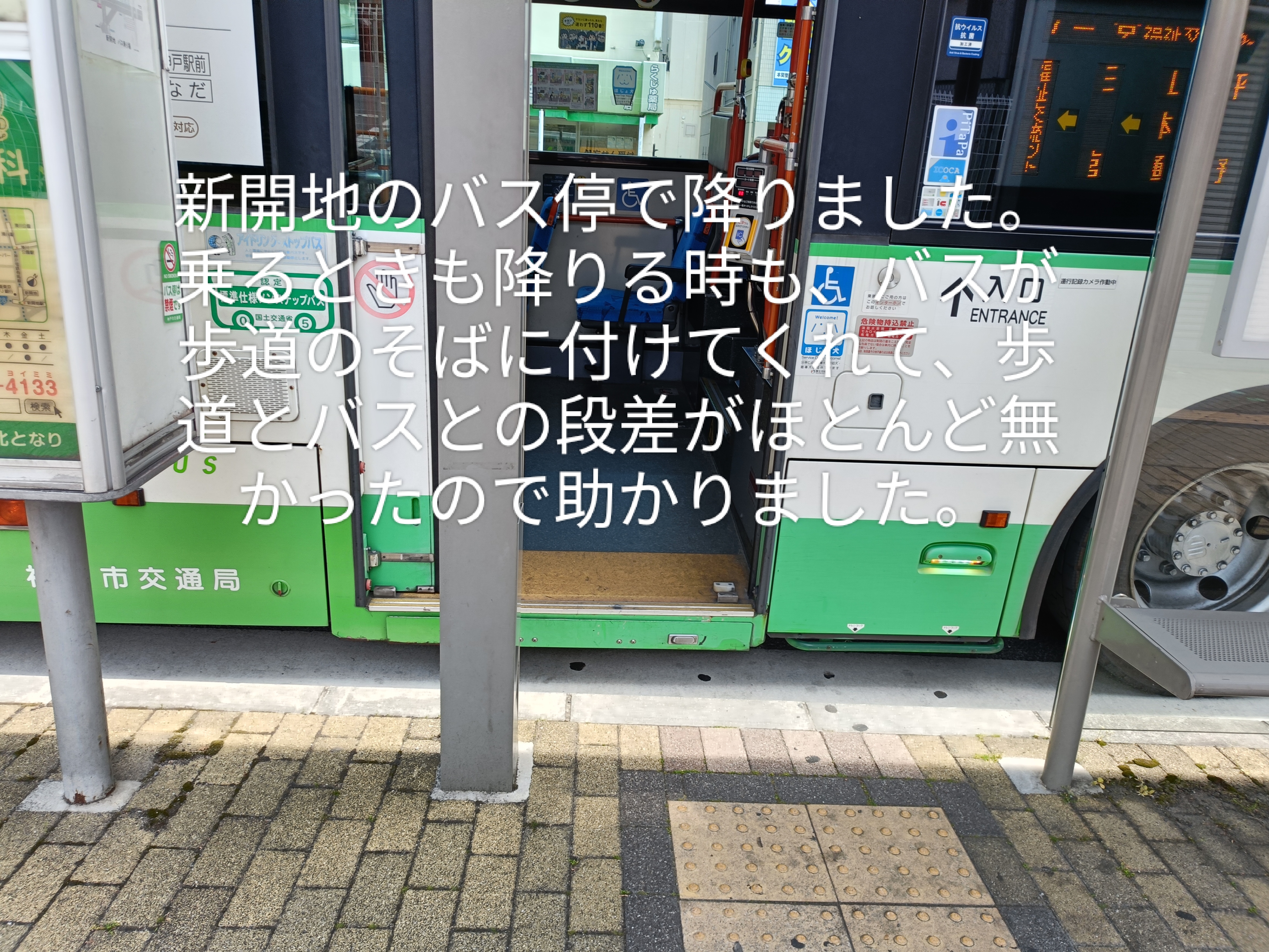 新開地のバス停で降りました。乗るときも降りる時も、バスが歩道のそばに付けてくれて、歩道とバスとの段差がほとんど無かったので助かりました。