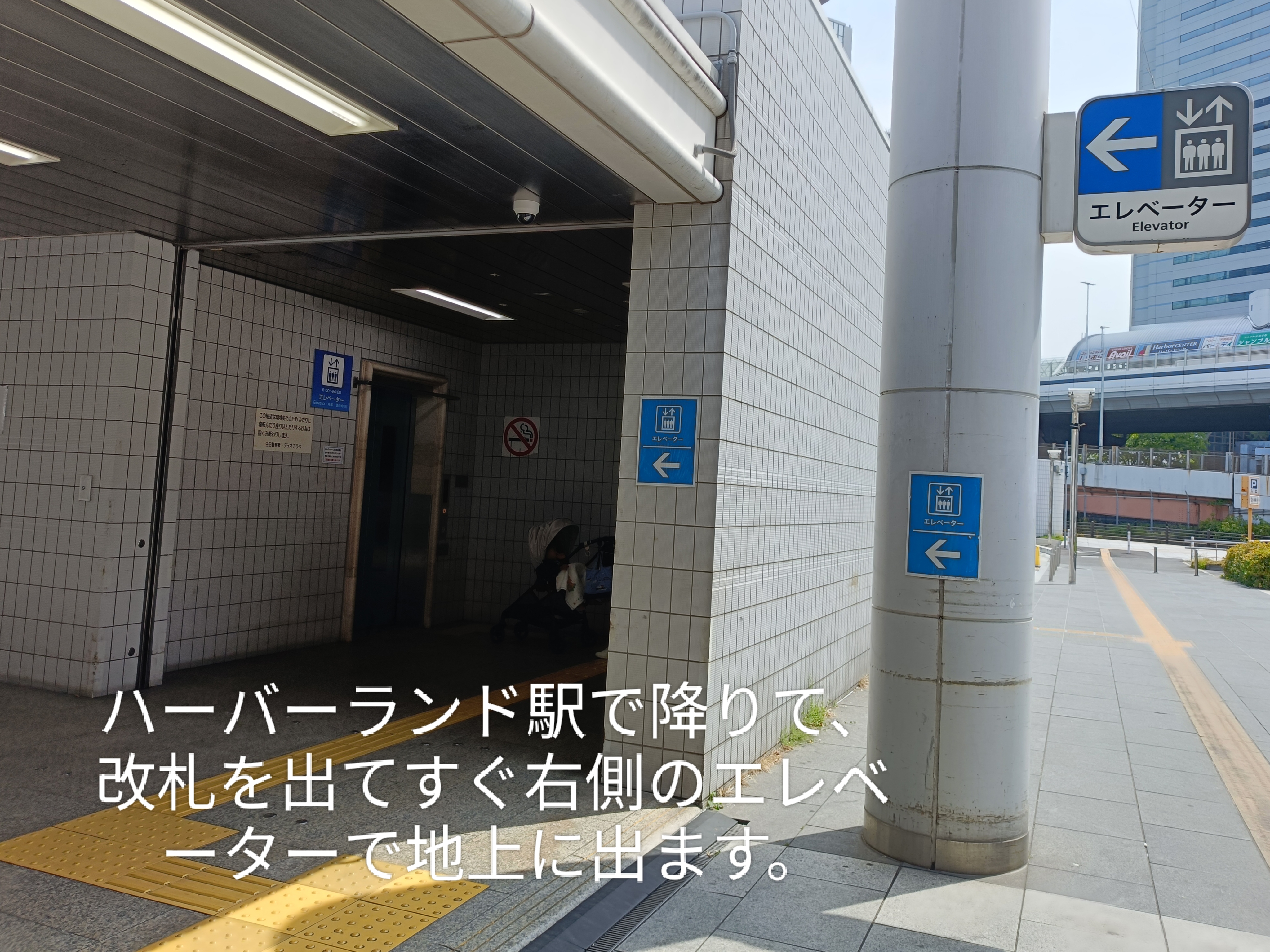 ハーバーランド駅で降りて、改札を出てすぐ右側のエレベーターで地上に出ます。