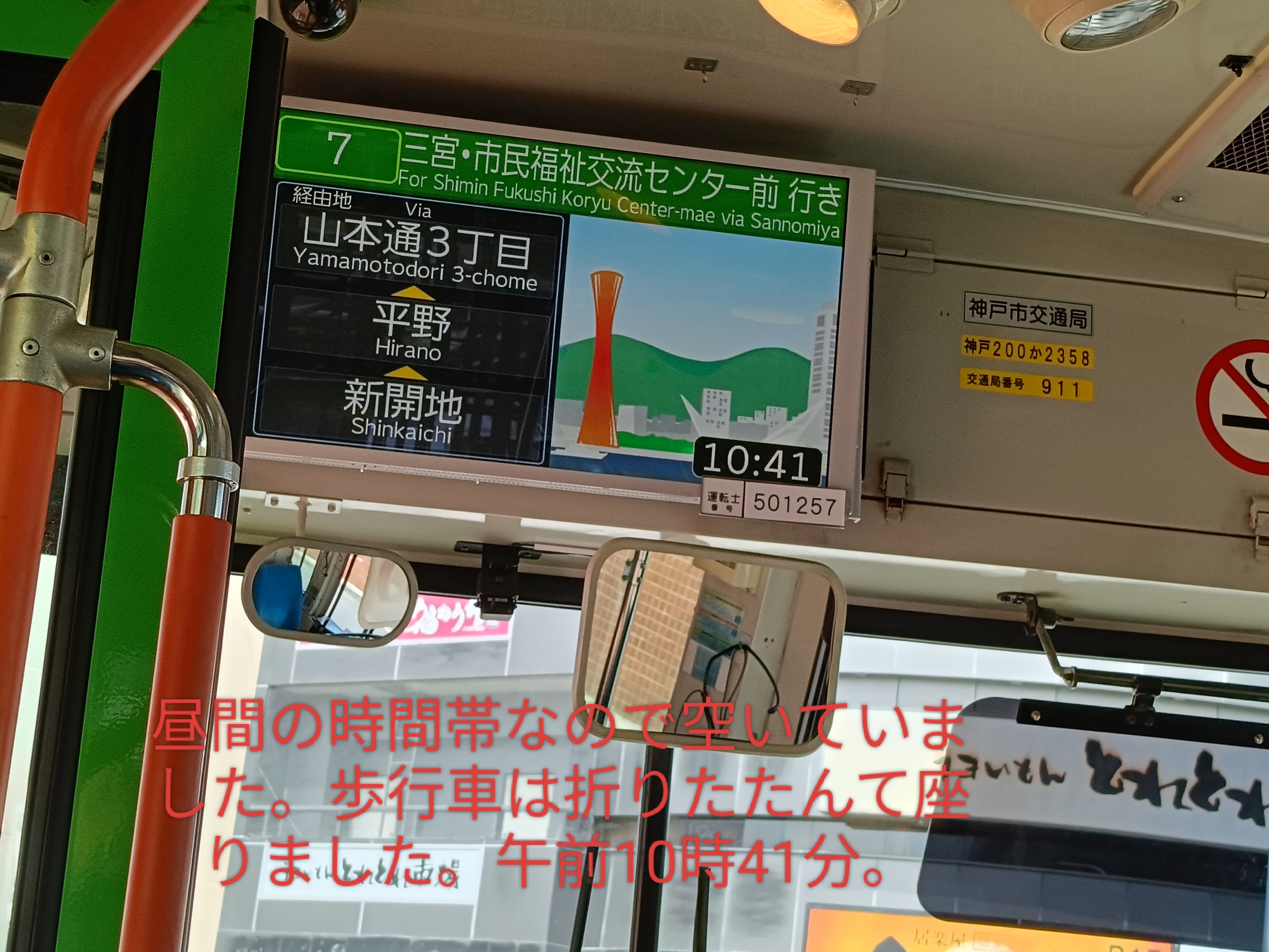 神戸駅の山側のバスターミナルに横断歩道で渡ります。程なく7系統のバスが来たので歩行車で乗りました。