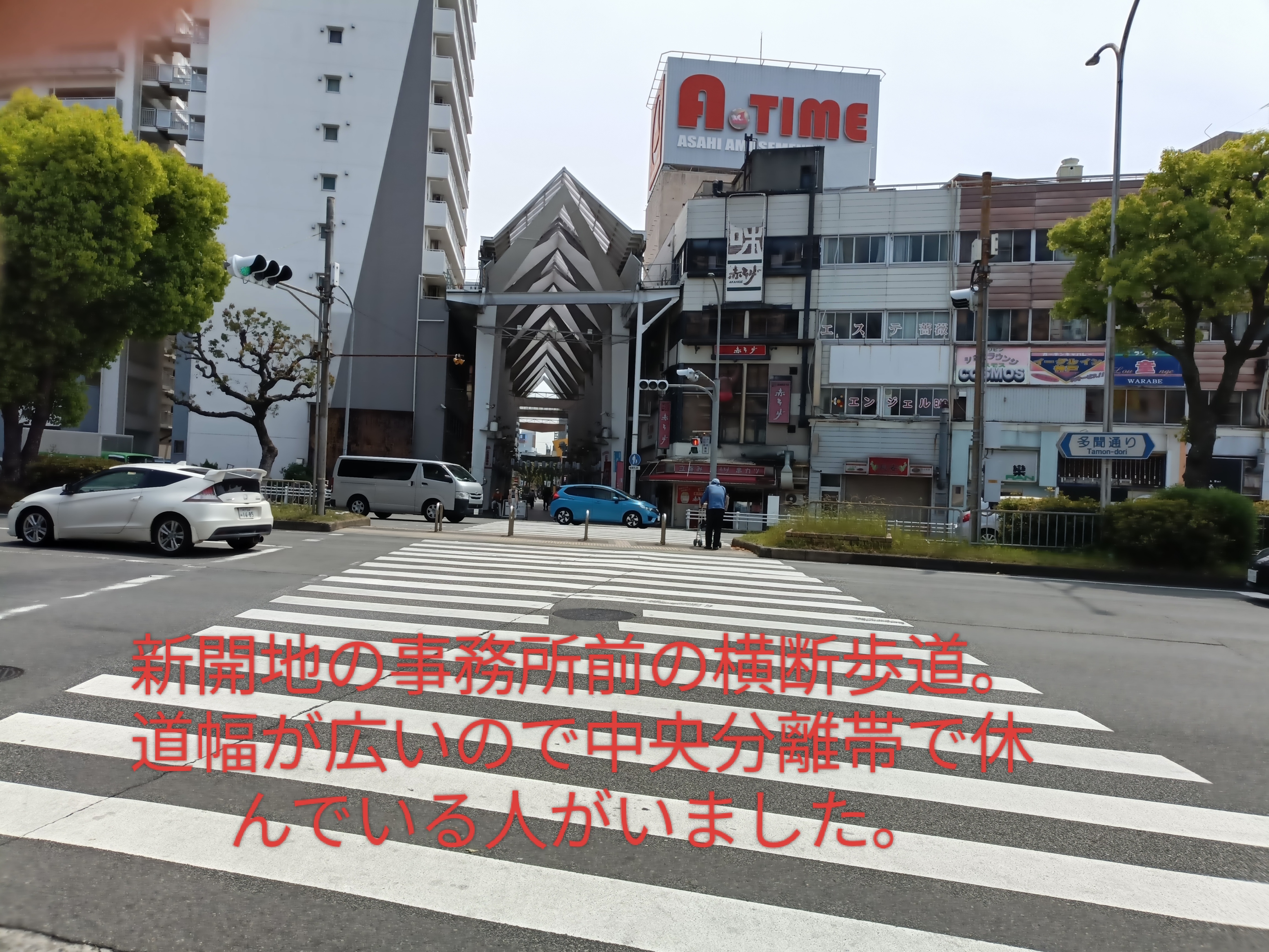 新開地の事務所前の横断歩道。道幅が広いので中央分離帯で休んでいる人がいました。