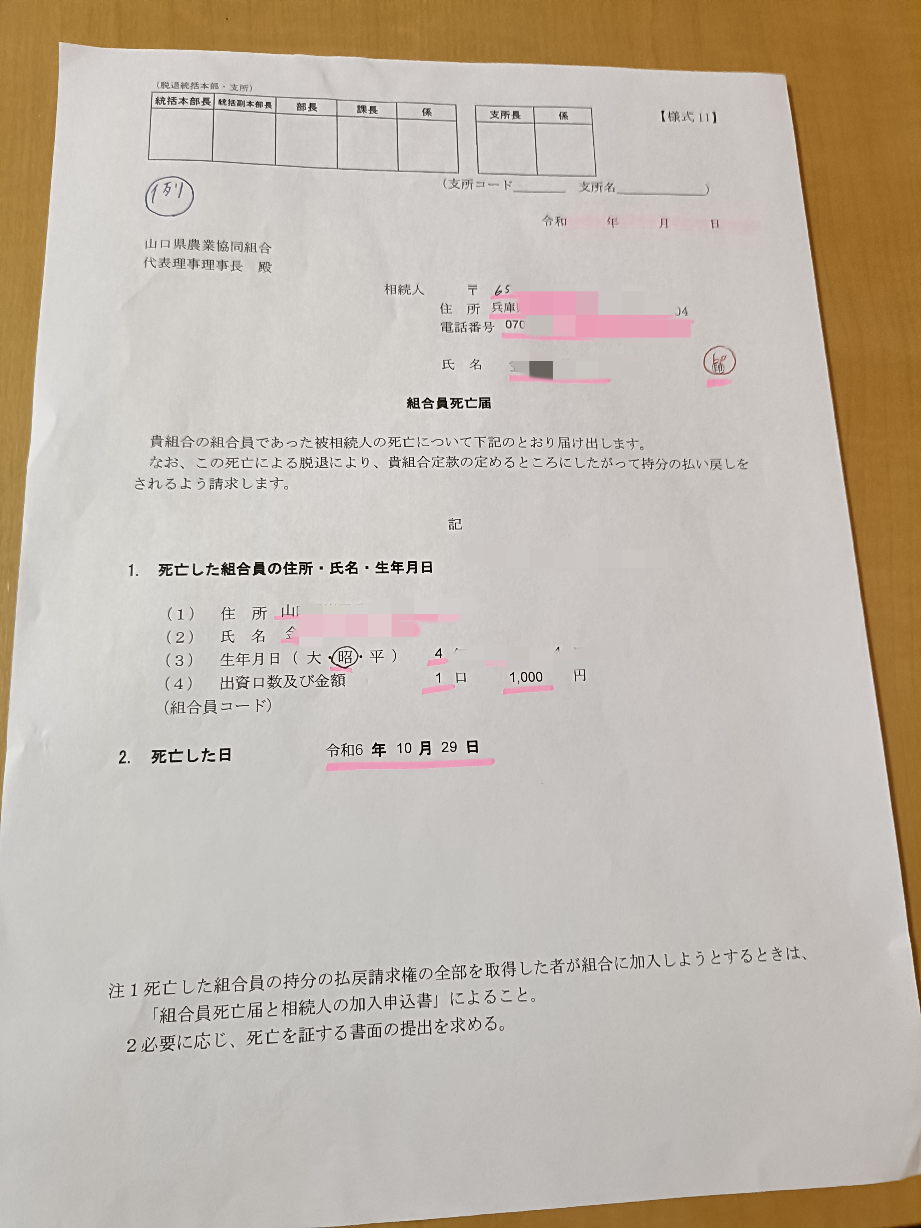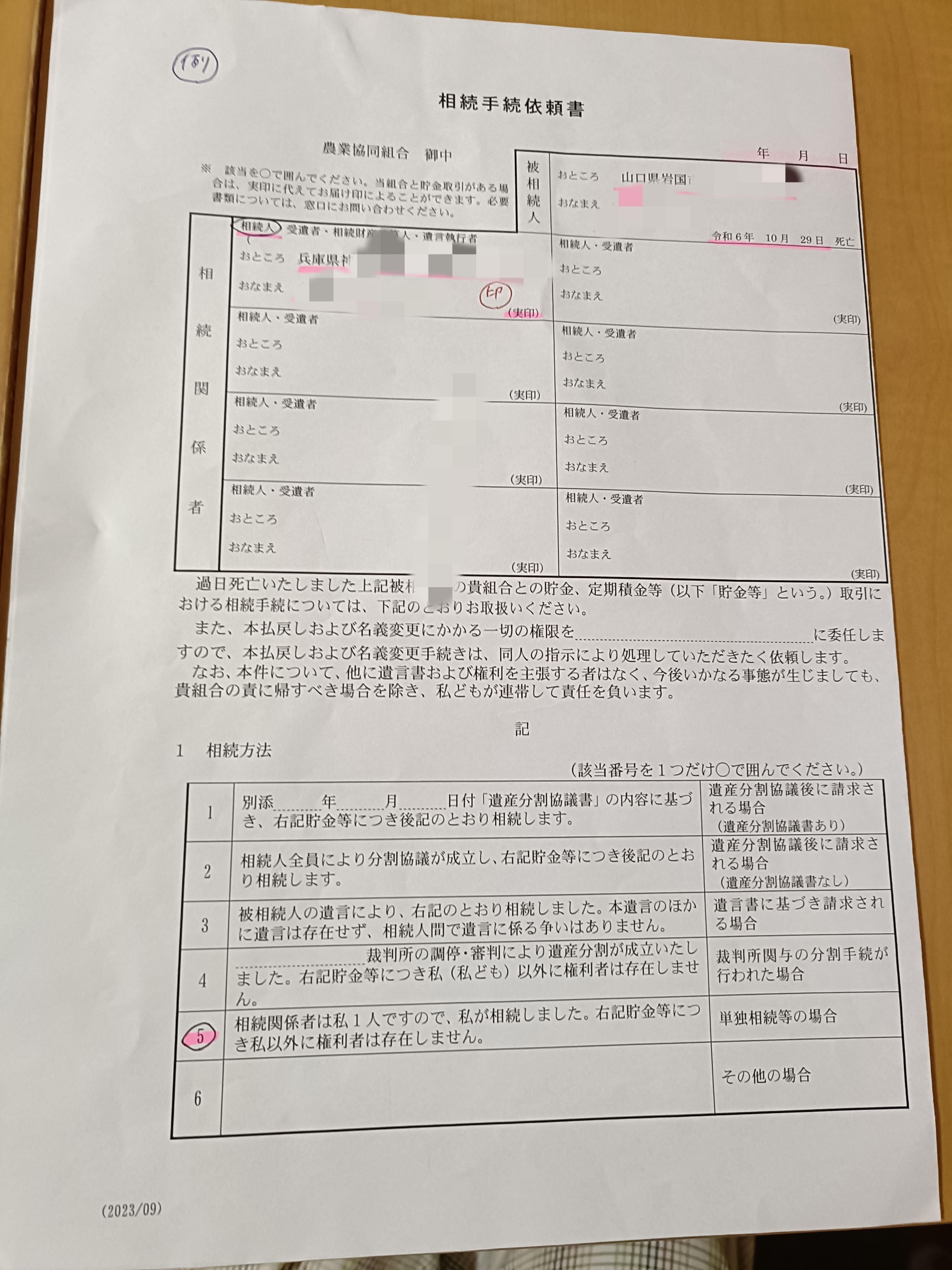 死亡届に記入。母の原戸籍謄本、除籍謄本、印鑑証明書などを同封して、4月3日にJAバンクに郵送。