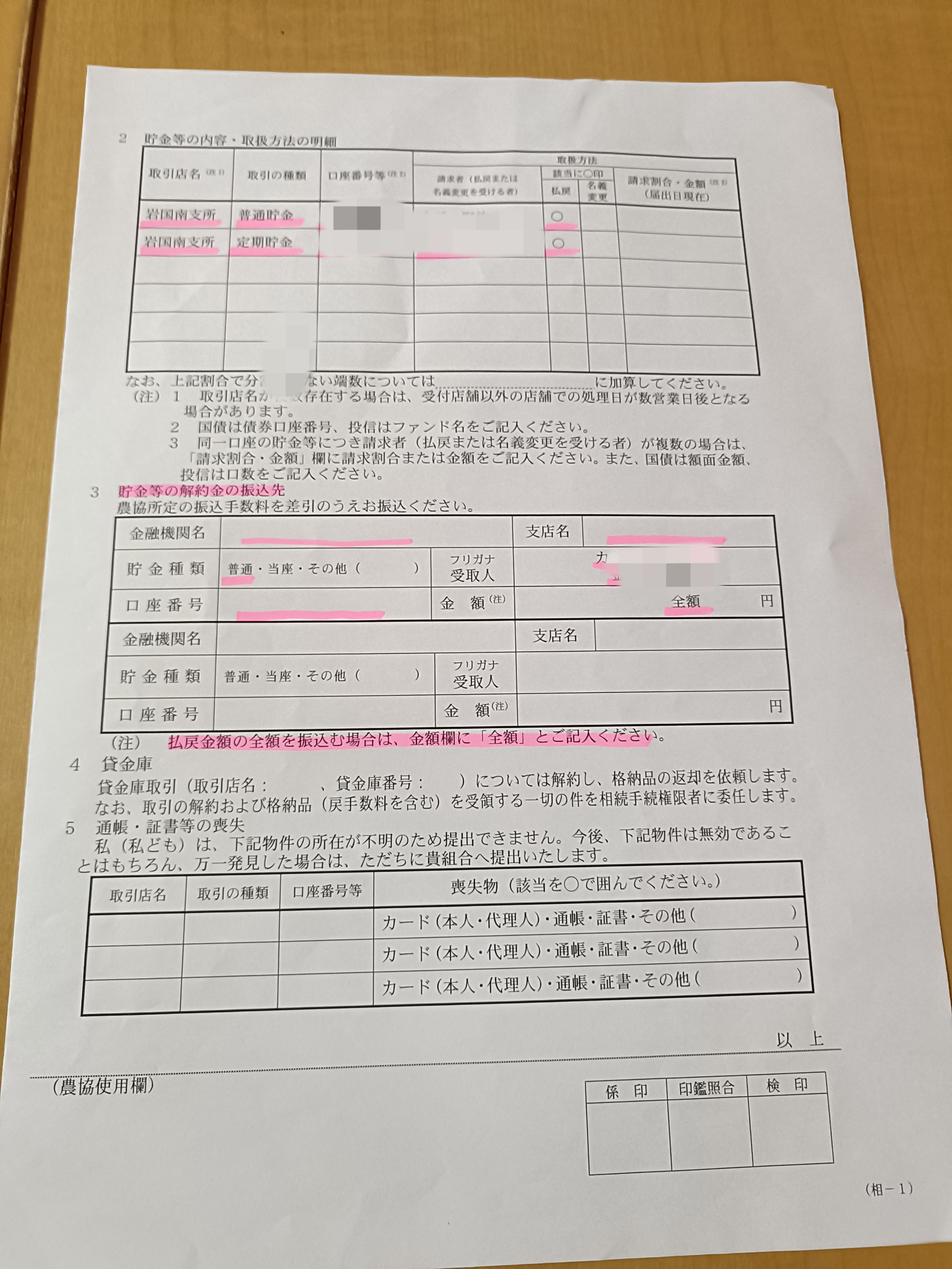 松田病院に入院中にJAバンクに 連絡して、相続の手続きをお願いした。
