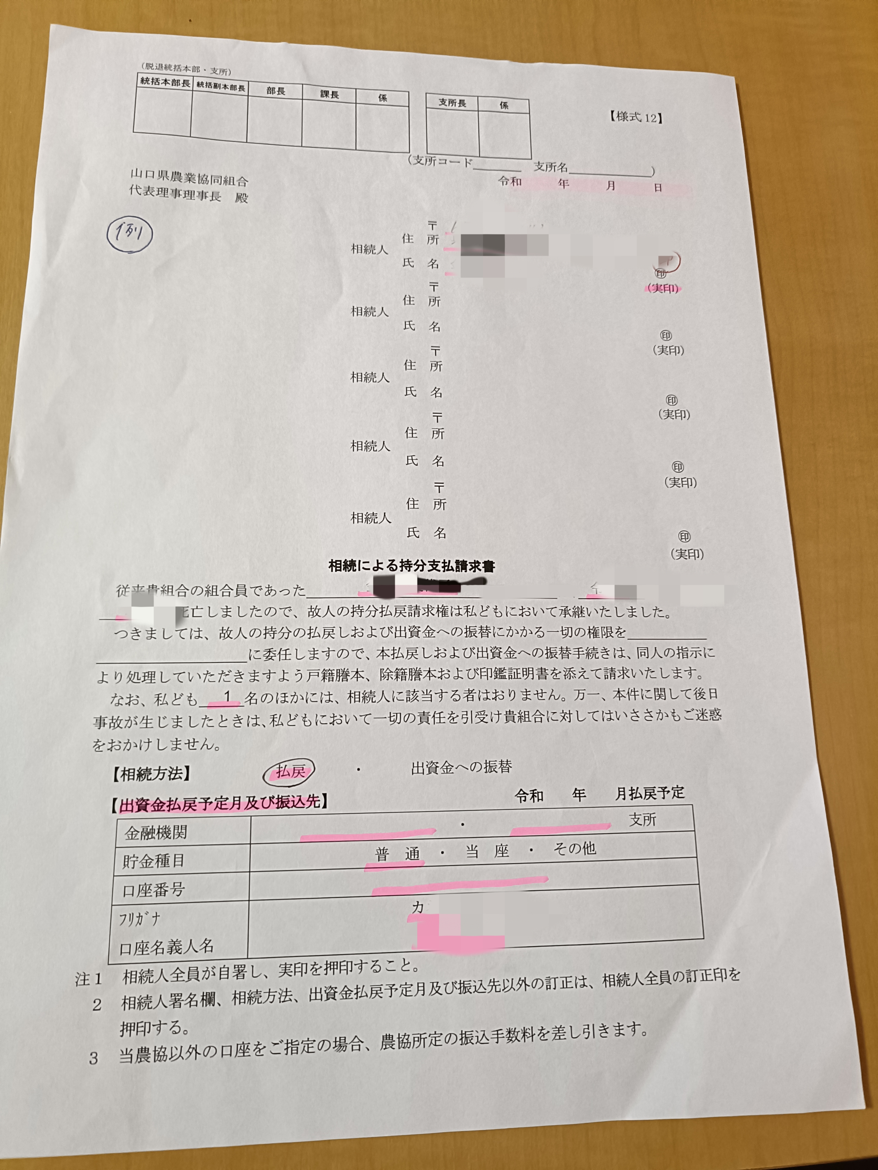 なかなか連絡が無いので、4月17日にJAバンクに督促の連絡。戸籍謄本などは問題無しという事で、4月23日頃に実際の申請書類などがやっと送られて来た。