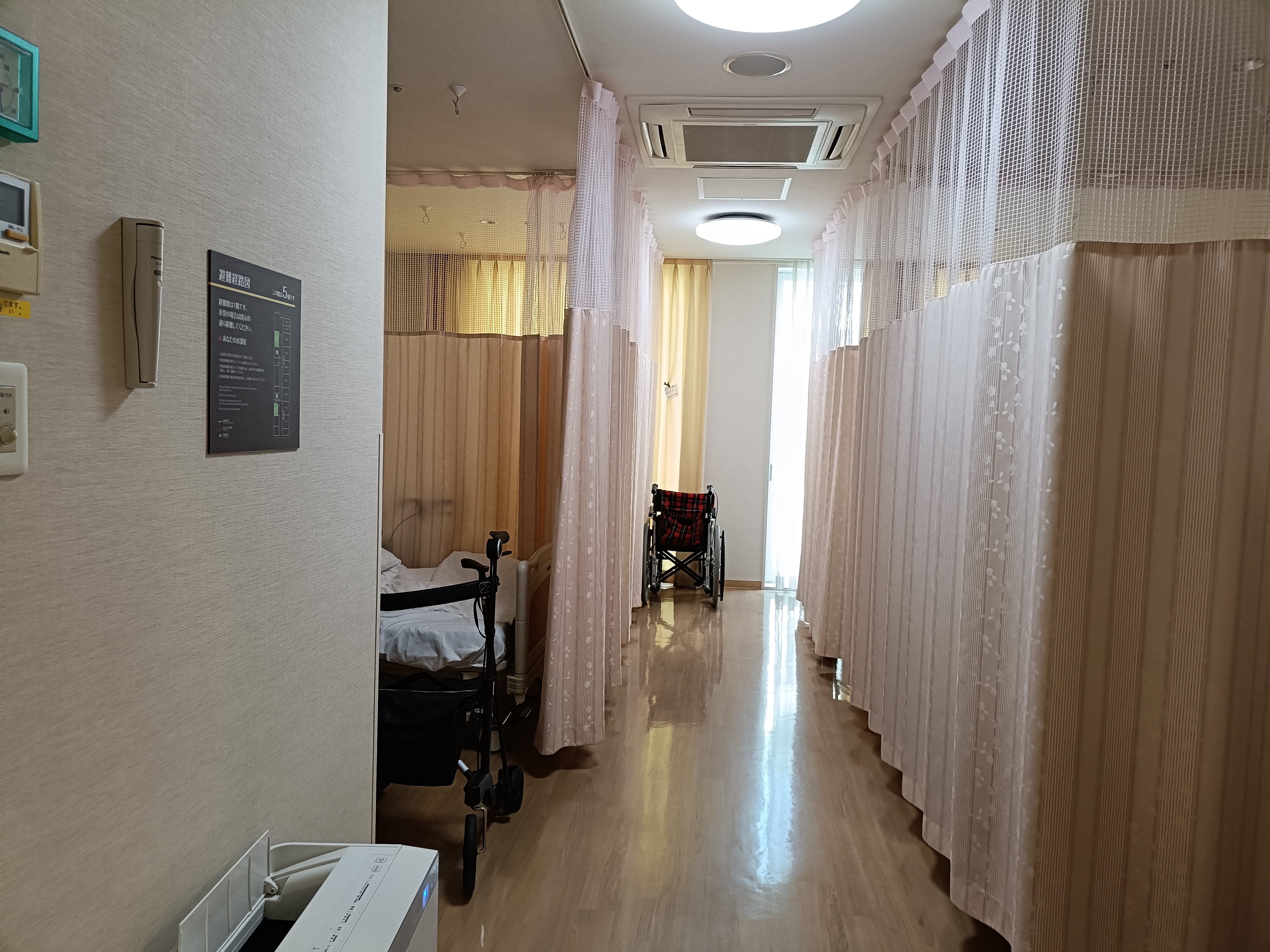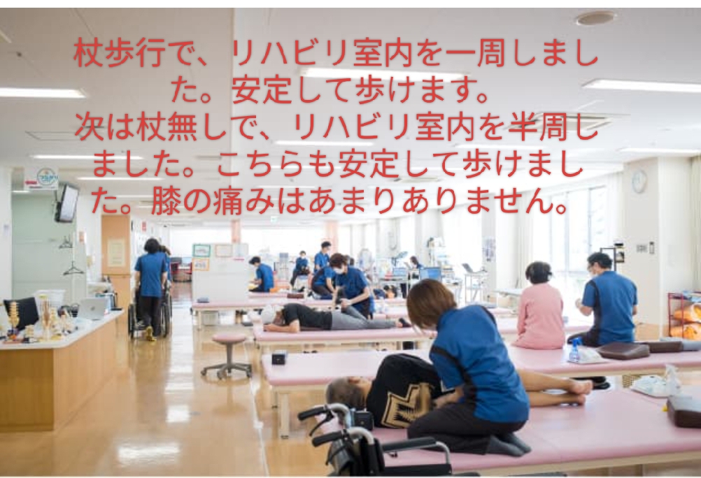 次は杖無しで、リハビリ室内を半周しました。こちらも安定して歩けました。膝の痛みはあまりありません。
