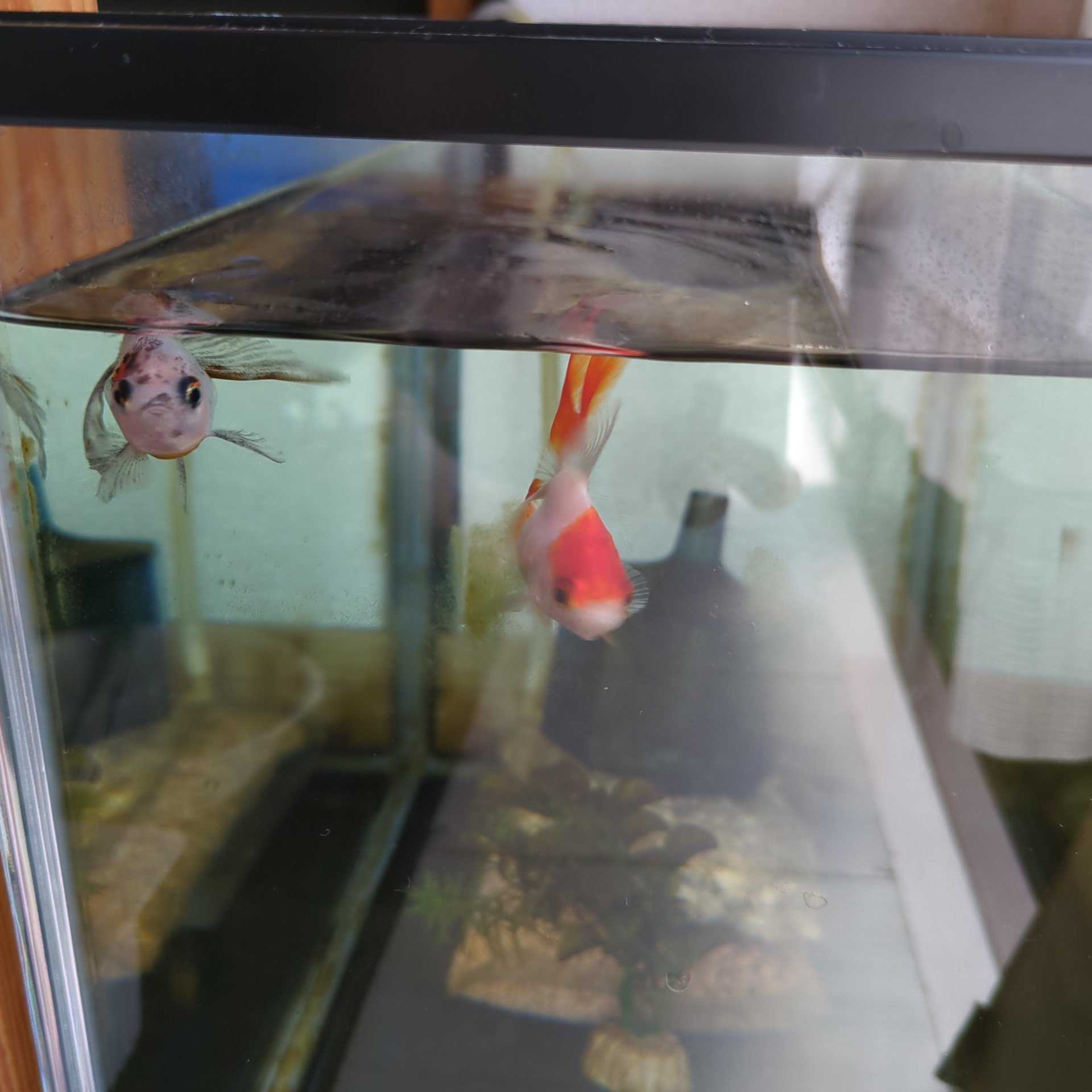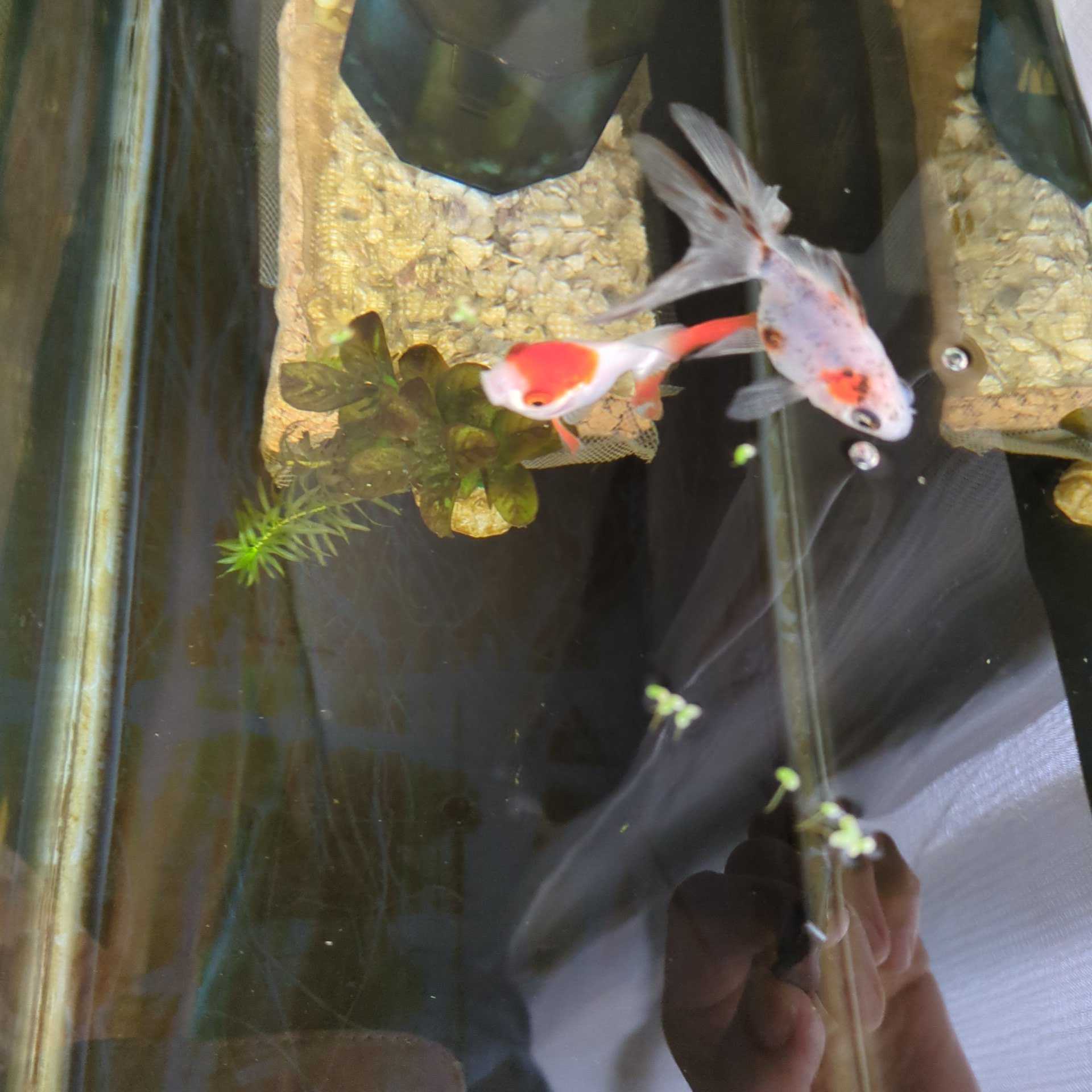 紫福ちゃん ​(新入り) (右)更紗琉金の​ 日ノ出ちゃん ​(先住)
