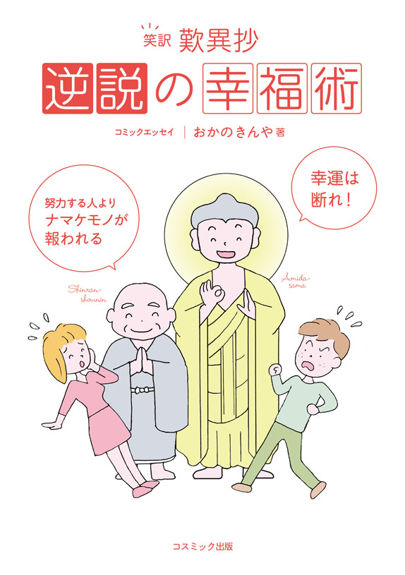 きんまるの、新しい本が、できました。笑訳・歎異抄 〈逆説の幸福術〉 コスミック出版という、本です。コミックエッセイです(^-^)ノ昨日、見本の本が、出版社から送られてきました。売り出しは、今月の21日からです。内容は、歎異抄の親鸞さまの、幸福術をきんまる流に、アレンジした、エッセイと、4コマ集です。前書きを、のせたほうが、わかりやすいですね。_________ 【まえがき】「あのね、善い人よりも、悪い人の方が、神さまに、気に入ってもらえるんですよ」もし、偉い人に、こんな〈非常識〉ことを言われたら、ショックと、パニックで、今までの〈常識〉が、フリーズしてしまいます。でも、それを、確信犯的に、言ってのけたのが、親鸞です。〈歎異抄〉の「善人なをもて往生をとぐ、いはんや悪人をや」は、八百年後の現在でも、生き続けている〈名コピー〉です。もし、親鸞が現代に生まれていたら、〈天才コピーライター〉になっていたかもしれません。〈宗教〉に関心がない人を、〈驚かせ〉思わず注目させる。〈謎〉と〈好奇心〉で、「はてな?」と思わせ、引き込んでしまう。親鸞先生、やるな~、です。〈倫理〉や〈道徳〉は、人の都合で変化します。親鸞は、その奥にある、永遠に変わることのない、〈真理〉に生きた人です。親鸞が生きていた時代、僧侶は、〈エッチをしてはいけない〉〈お酒を飲んではいけない〉〈お肉を食べてはいけない〉、という厳しい戒律がありました。ところが、裏に回ると、それを守らない高僧がたくさんいました。親鸞は〈本音〉の人です、〈偽善〉を嫌い、その当時の僧侶としは、初めて〈結婚〉し、〈お肉〉も堂々と食べたのです。親鸞の言葉は、よく、〈逆説〉のように取られますが、本人は、命がけの、大まじめで言っていたと思います。だから〈本音〉だらけの親鸞の言葉は、とても、面白いのです。現在、親鸞の言葉を集めた「歎異抄」がたくさん出版されています、どれも素晴らしい本ばかりです。ところが、寝転がって、テレビでバラエティーを見るのが好きな、一般庶民の私には、難しすぎます。あと、やっぱりギャグも欲しいです。そこで、私が感じている、親鸞の面白さを、皆さんにお伝えするために,〈歎異抄〉を私流に〈超意訳〉してみました。さらに、コミックと組み合わせ、より親しみやすくしました。そして、それを〈笑訳・歎異抄〉と命名したのです。世界一、楽しく、わかりやすい〈歎異抄〉です。_________というわけで、早く発売の日が、待ち遠しいきんまるです(^-^)ノ♪チャンチャン♪
