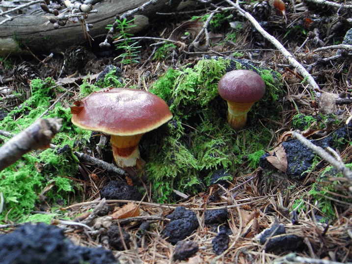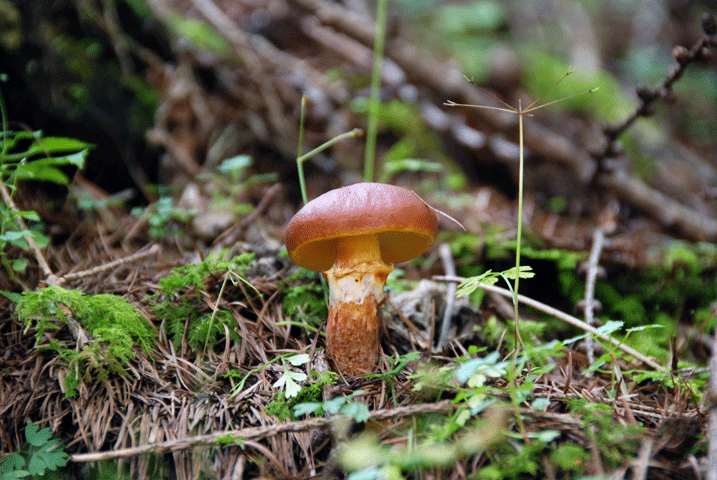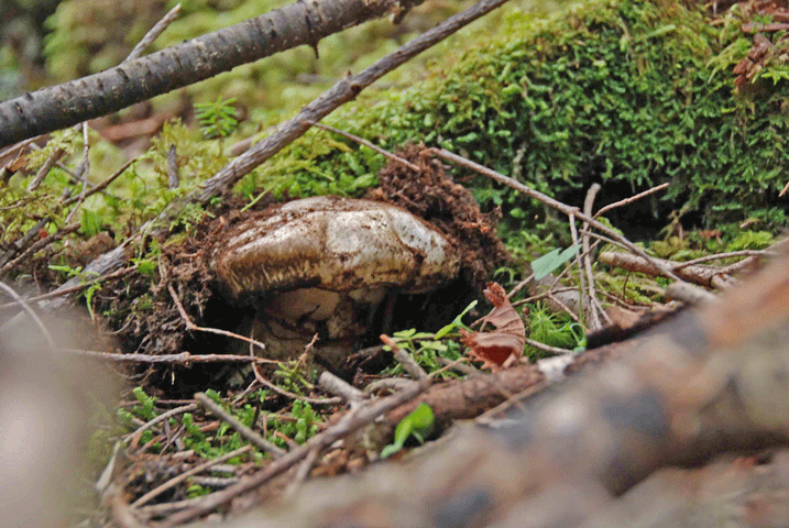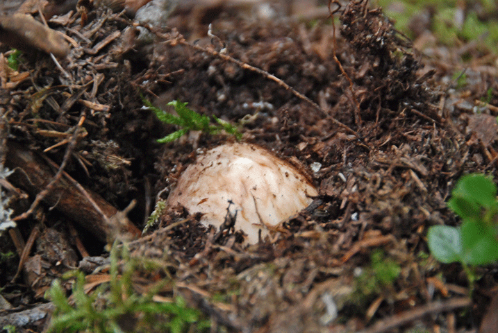 「オオモミタケ」連休初日は、高速が混むと予想して出かけたのに、それ以上の混み具合で約束の場所に17分も遅れてしまいました。昨日はブログ仲間である「モモクリ」さんと初対面の日。最初から遅刻してしまうという、礼に反する事をやらかしてしまったのです。それでも気持いい挨拶を交わして、一緒に散策を始めました。夏から採れ始めるオオモミタケが、この時期になってやっと見つかりました。今年初めてです。大きいので採りがいがあります。 「クロカワ」仲間の羨望の的であるクロカワ。大猟の報告を毎日のように読んでいるので「まあ、少し採れたらいいかな」という思いで山へ駆け上がると、なんとまだ採った事がないというモモクリさんが「あっこれじゃないですか?」と、入山して3分ほどで発見。恐るべしです、モモクリさんのきのこ目。。。その後もゆっくり歩くとそれぞれ結構な収穫。あり難いです、この御山の底力の強さに感謝・感謝です。 「トビイロノボリリュウタケ、シャグマ??」こんな面白い形の、トビイロノボリリュウかシャグマアミガサか同定できないものもありました。後ろの方にニューっと見えるのは何かしら?反対側からも一枚撮ってきてほしかったです。(この写真は相方担当)「ねえ・・私達最後まで離れることなく、ずーーっと一緒よね。」「もちろん、いつまでもどこまでも君を離さないよ。」「まぁ~うれしいぃ~~」という会話が、このハナイグチから聞こえてきました。二人を離してしまうのは忍びないので、両方同じカゴに治まってもらうことに・・。「あなたぁ~~」「大丈夫、鍋の中まで一緒だよ・・・」と言うのが最後に聞こえてきた会話でした。あぁ~~何だか罪悪感を感じてきた・・・。数年来重宝してきた杖を失くしてしまった私。「松茸センサーが仕込まれている」という噂が飛び交っていたのに・・・三人で歩いていたのですが、杖を置き忘れた私は一人離れて元来た道順を戻る事に。丹念に探して歩いていると、「うん??、あれはまさしく麗しの松様のお姿・・」と、杖じゃなくて、松様を発見してしまったのです。大きくてしかも埋もれ木に邪魔されていたので、シロを荒らさないように掘るのが大変。一人で歩く事はないので、焦ってしまいました。500mlのペットボトルと並べてもこの大きさ。重さは、365gで、今期一番の大きさでした。結局失くした杖は見つかりませんでしたが、松茸センサーは杖についているのではなくて、私の体にあるのだということが今回分かりました。コメツガさんゲットの松姫を見ながらのランチタイムはきのこ談義で楽しく、モモクリさん差し入れのデザート「焼きんとん」も美味しくて、秋風香る御山の一日は最高の日となりました。今回ゴミ拾いに参加してくださったモモクリさんも、「御山のきのこ菌の感染者」になってしまったようです。今日はスッキリと晴れた空の彼方に、綺麗な御山の姿が望めます。心の中でそれを見ながら『いつも有難う』と手をあわせました。
