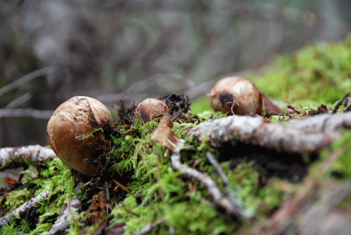 仕事はしなきゃいけない、でも9月の御山はきのこがボコボコ。気持はここにあらず・・・。そこに仲間からの誘いがあれば、つい楽しい方へと心が流れてしまう。ということで、連休2回目の御山出勤。秋の彩をまとい始めた樹木や草花が目を楽しませてくれます。道端に咲いた『フジアザミ』は、我も我もと押し寄せる車の排気ガスにも負けず、ボンボリのような花を控えめに下向きに咲かせていました。駐車場に一番に到着していたコクワさんに朝の挨拶をしてから、山へ・・。三日前は、沢山でていたナラタケとクロカワも数が少なくなっており、それでもゆっくり目こぼしを探しまわりました。きのこの整理をしていると、華やかな花水木さんの声が樹林から聞こえてきました。今回はドクターTさんも一緒で、ナラタケやチャナメが採れていました。乾いた樹林はきのこの種類が少ないのですが、それでも律儀に出ていたオオツガタケ。今回も三姉妹。苔の中に白い足がスーっと伸びていました。こんな色の変化を見せながら、季節は確実に歩いていきます。夏から初秋にかけては、地面を見ながら歩きますが、これからは季節の移ろいを楽しみながら、あるいは惜しみながら様々な装いの木々や葉っぱを見て歩きます。そして晩秋は、このように樹木に発生するきのこが多くなる。この木には、例年だと10月に出てくるサンゴハリタケが、もうこのように・・・。裏側にも一個ありましたが、高い場所で収穫できませんでした。これからは、きのこ鎌を持って歩かなきゃ・・・。この収穫の図に、ヌメリスギ、チャナメ、ムキタケが載りはじめると、いよいよシーズンも残り少なくなります。寂しいなぁ~~これからの一回一回の散策は、風、音、香り、冷気等をしっかり体で感じ記憶に留めたいものです。