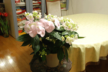 花屋の店先が、季節を先取りしたように賑やかになってきました。今回我が家にやってきたのは「冬あじさい」。「入間きのこ愛好会」の新年会にて、ビンゴゲームでいただいてきました。冬季に花開くあじさい・ピンクエレガンス。この季節に咲くのもめずらしいけど、ぐるりと咲いている花の大きさにビックリです。ベランダで育てる花木がまた一つ増えました。「宮さん」お手摘みのムカゴをいただいてきたので、今夜は「ムカゴご飯」にしてみました。きのこ仲間の「宮さん」は、実のなる植物をこよなく愛し、庭にやってくる小鳥達に声をかけながら餌を与え、草花を観察しては銅版でポートレート壁飾りを拵え、ポツポツと話してくれる事柄はホントなのか嘘なのか時に迷うような面白い話・・・・。初対面の時、束ねたロン毛が印象的で、遠目に女性と間違えてしまうような風貌にビックリしました。そんな宮さんが冬場に少しずつ摘み取ったムカゴを使ったご飯は、ほっこりとした優しい味わいでした。最初に乾煎りして醤油味を付けてから炊飯器に入れましたので、ご飯が薄い醤油色になりました。そうなると、見た目の色と味わいというのを、今までの経験から脳が予想するわけで・・・。私の場合・・・醤油色というと魚介の旨みを期待しているようで、最初に口に入れた時は少し物足りなさを感じてしまいました。それもそのはず、相方の帰宅にあわせた炊き上がりを軽く味見しただけ。最近、夕飯は野菜中心にして一人早めに食べるようにしています。そろそろ芹摘みの季節、若緑色の混ぜ込みご飯も食べたいな・・・出不精を治さなくては。