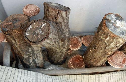 夏場片手でヒョイと持ち上げられるほどに乾いていた椎茸のホダ木菌糸もダメになったかもと思いながらも諦めきれず、一週間ほどドブンと水に浸しておきました。木肌が破れるように白い菌糸が見えてきたので、ベランダで光を遮蔽して水遣りの毎日・・・。夜の冷え込みにつられるように、掌ほどの大きさまで成長しました。知り合いに半分お分けして、残りは我が家で焼き椎茸塩と醤油で食べ比べてみましたが、塩味の方が椎茸の甘みが引立ち風味が口中に残りました。今回は強制的に菌糸の活動を促しました。自然のままに水遣りだけしていたら、もっと寒くなってからの発生だったと思われます。ということは、もう一回ぐらい出てくれるでしょうか・・・。それとも、待ちきれずにまた水風呂に入ってもうらうことになるかもしれません。