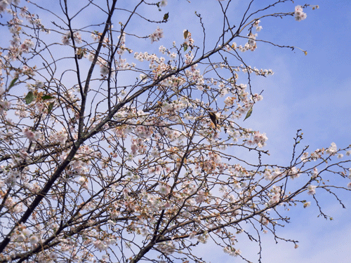 晩秋ではありますが、満開の桜を・・・。街路樹の中の一本の桜が満開をむかえていました。気候のせいなのか、それとも私が知らないだけで毎年晩秋に花を見せていたのでしょうか。南天の実と満開の桜・・・季節が読み取れない一枚です。昨夜からの雨が恵みになっているかもと、近くの公園へ・・・。今までの乾燥がきのこにとっては厳しかったのか、地上生のきのこは二本見ただけ。溜木場で、やっと食菌を見つけました。まだ一度も乾燥したことがなさそうな出始めの柔らかいキクラゲで、高い場所に出ていたので持ち帰りました。そして一見したところ「クリタケかな?」と間違ってしまいそうな不明菌とキクラゲ・・・。きのこ狩りのシーズンは終わっても、散歩の途中できのこに会えたら幸せです。正確に言うなら・・・きのこの姿を探すために散歩へ・・です。公園の隅々まで歩きたかったのですが、途中で雨脚が強くなってきて散歩終了。何だか気持ちに締まりがない週末を過ごしました。外で楽しめないならと、ベランダの椎茸とヒラタケのホダ木に毎日水遣り・・・。椎茸には出始めの芽が見えてきました。ヒラタケのほうには白い菌糸がはびこってきました。いつもなら落ち葉を集めてきてホダ木の表面を覆うのですが、今年の落ち葉使用は考えものですので、スチロール箱の蓋にて日陰にするための工夫をしました。椎茸の方は間違いなく出てくると思いますが、ヒラタケ発生には自信がありません。