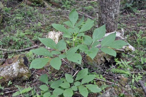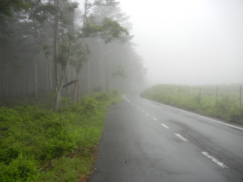 「行けばよかったかな・・・」という後悔をしたくないのと、ベニバナヤマシャクヤクの開花時期の短さを考えて、昨日も山へ。雨もさることながら深い霧で、樹林では方向感覚を失ってしまいそう。天然のミストシャワーを浴びていると思えなくもないのですが、ぬらぬらと濡れた葉っぱと途切れることなく沸き立つ霧がまとわりつくと、胸の中になにやら得体のしれない不安感が広がっていきます。肌寒さを感じる樹林にはきのこの姿は少なくて、歩いた範囲で群生していたのは開けた山道に出ていた不明菌だけでした。オダマキの花がやっと咲き始めていて、今年の開花は昨年より一週間ほど遅いかな。うつむき加減に咲く花、雨の影響を受けずに虫たちの来訪を待ち繁栄を続けていくための知恵でしょうか。目的としていたベニバナヤマシャクヤクには今回も逢えませんでした。深山まで行かないと出逢えなくなったベニバナヤマシャクヤクは、チャナメさんのページで観賞させていただくこととします。悪天候で撤収が早まって、早起きして拵えた「おむすび」は、帰宅してからのお昼ご飯となりました。今日は雨も上がり雲間に青空も見え気温も上がってきました。次回はきっとお花畑も見頃となって、楽しませてくれるでしょう。そろそろ夏きのこも採りたいです。