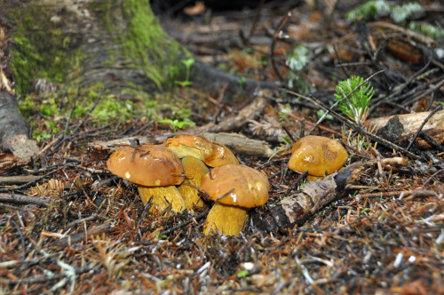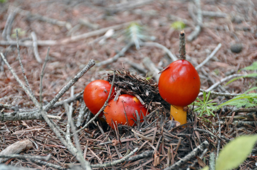 情報としては新しくありませんが、19日に見た「きのこ」たちです。タマゴタケは、前回に続いて沢山見かけました。成長の変化を観察しようと、真っ白なタマゴ状態を持ち帰りましたが、極端な環境の違いからか紅色のカサは出てきませんでした。(スライスして炒めました。)ハナビラタケは、散歩気分で「採れたらラッキー」と・・・。見通しがいい場所でのハナビラタケ、クリーム色が綺麗。色がくすんでいるのは、薄暗い森に在ったからでしょうか。大きな個体でした。コガネヤマドリタケは、色合いの濃いものから薄いものまで、カサが開いたものから出始めのコロンとした状態の個体まで、よく見かけました。カサは地味な色合いなのに、柄は綺麗な紅色の網タイツをはいたようなアシベニイグチ。イマイチ写真がボケていますが、その魅力に惹きつけられます。今季初お目見えのキホウキタケは、遠目にはハナビラタケの幼菌と間違えました。標高を上げて歩いてみましたが、上の方にきのこの姿は少なくて、短時間撤収しました。帰る頃になって雨が降り始めましたので、今頃はいい湿り具合じゃないでしょうか。今日(21日)東海地方まで梅雨明け、明日辺り関東も梅雨明け宣言されるかもしれません。盛夏になってから、適度な雨が降るという天気が続いたら今季は楽しいきのこ観察が続けられそうです。