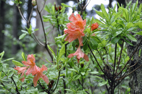 20日、久しぶりに山へ。まだ目覚めぬ野イチゴやオダマキの花々の開花を促すように、ヤマツツジが咲いていました。季節の歩みは年々早足になっているのでしょうか。それとも、この場所の地温だけ高いのか、一か所だけベニバナイチヤクソウが群れていました。お目当ての花はベニバナヤマシャクヤクでしたが、見つけることができませんでした。樹林の香気を吸い込みそれを力に変えることが一番の目的でしたが、ハナビラタケを見つけてしまうとそんな気持ちはどこへやら、目の奥にメラメラと欲の炎がともり始めます。水をたっぷり取り入れたきのこは、クサウラベニタケのようでいてヒダの開き方はホウライタケのよう。クサウラ・・・かな。ツガマイタケは、遠目でいつもヒラタケと間違ってしまいます。しかも毎年のように。二か月間ほど車が無くて自宅にこもりがちの日々、山菜採りにも行けず大人しくしておりました。運動不足で、後半の散策は足の筋肉がプルプル、筋肉痛が今も残っています。車も来たことだし、さぁ行動開始です。
