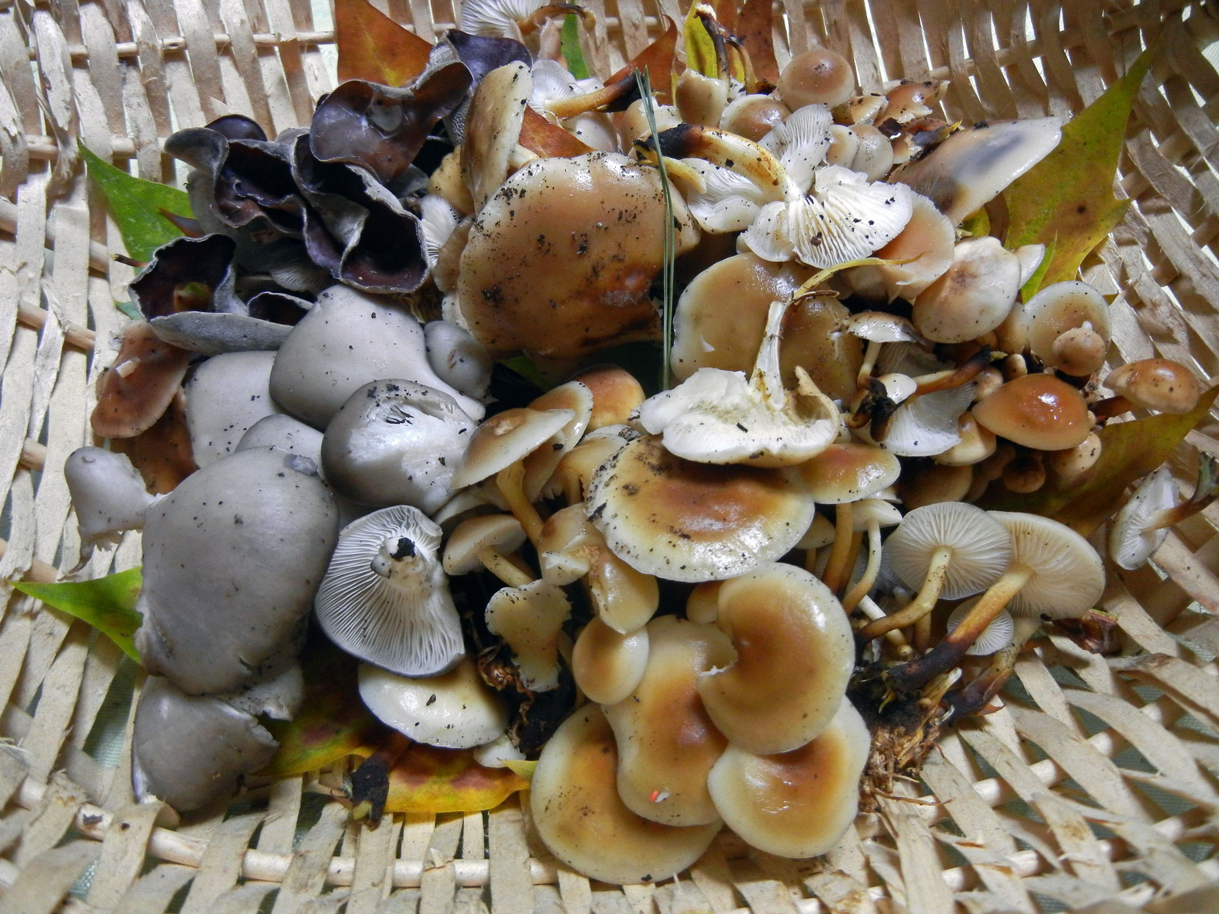 鹿児島から戻って早々遠出して、車窓から紅葉を眺めながら自分を取り戻すための散策。仲間に触発されての「黒いお宝」探しでしたが、簡単に見つけられるはずもなく、林道脇の倒木に出ていたヒラタケ・エノキタケ・アラゲキクラゲを収穫。晩秋の気配濃厚の林道を歩けただけでも「もしかしてここは天国?」なんて思えるほどの幸福感に浸れました。自分の好きな空間に身を置くことの大切さをしみじみ感じます。