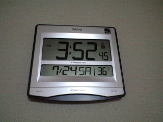 今日は、土曜日で会社お休みで、一日家でゴロゴロしてました。1時過ぎに、広報のスピーカーからのアナウンス。「こちらは、広報多治見です。ただいま、多治見市内の気温が36度を超えました。熱中症に注意し、戸外の作業は控えるようにしましょう。」とのこと。そういえば、夏になると、いつも放送してますね。結果的に、本日は、多治見市は、38.6度で、3日連続で最高気温日本一をマークしました。これ、おいらの家の階段にかけてある時計&温度計。午後4時前ですが、36度です。暑かった~。この温度計の下に焼酎ケースが積んであるのですが、大丈夫かなぁ。明日は、多治見高校と土岐商業の高校野球岐阜大会の準決勝をテレビ観戦の予定です。がんばれ、多治見高校!あと二つ勝てば、甲子園だ!
