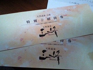 久しぶりの雨ですねぇ。関東地方は、大変なことになっているようですが、当地は、今朝、少々まとまった雨が降って、昼過ぎにはあがってました。いつ応募したのか忘れましたが、懸賞にあたりました。天然温泉「三峰」のペア入浴券。本日、郵便で届きました。いわゆる日帰り温泉施設のようですけど、まだ行ったことありません。30分ぐらいでいけそうです。今度の日曜日に行こうかな、って嫁を誘いましたが、スルーでした。
