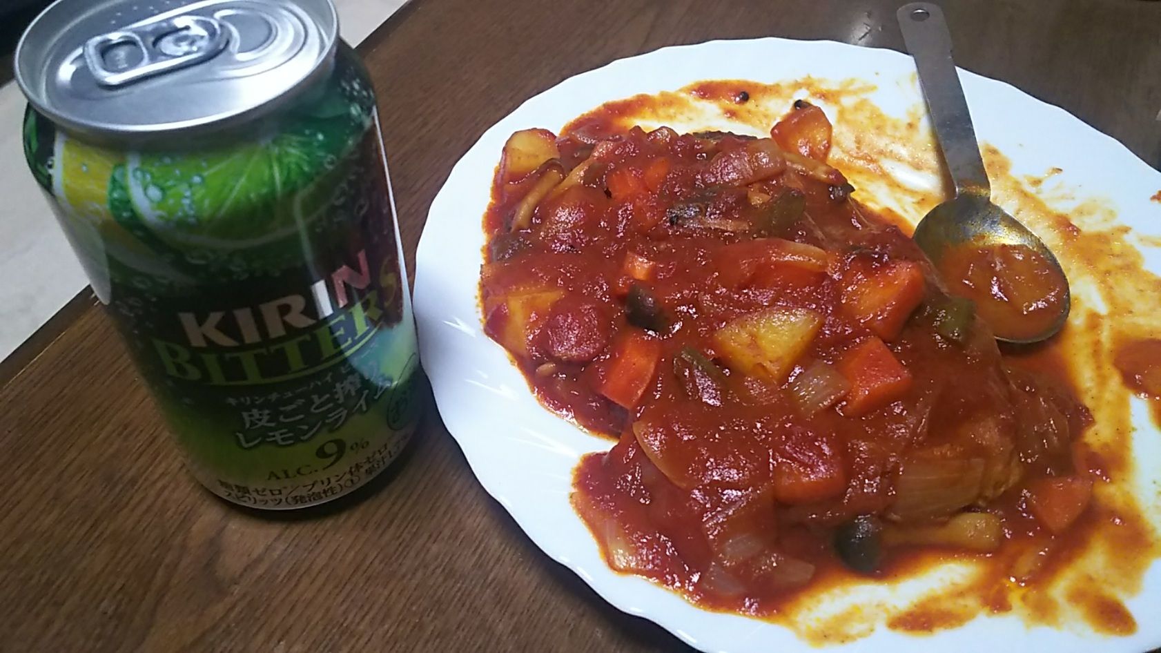 今夜のアテは、カジキのトマトソースかけ。美味しいです。